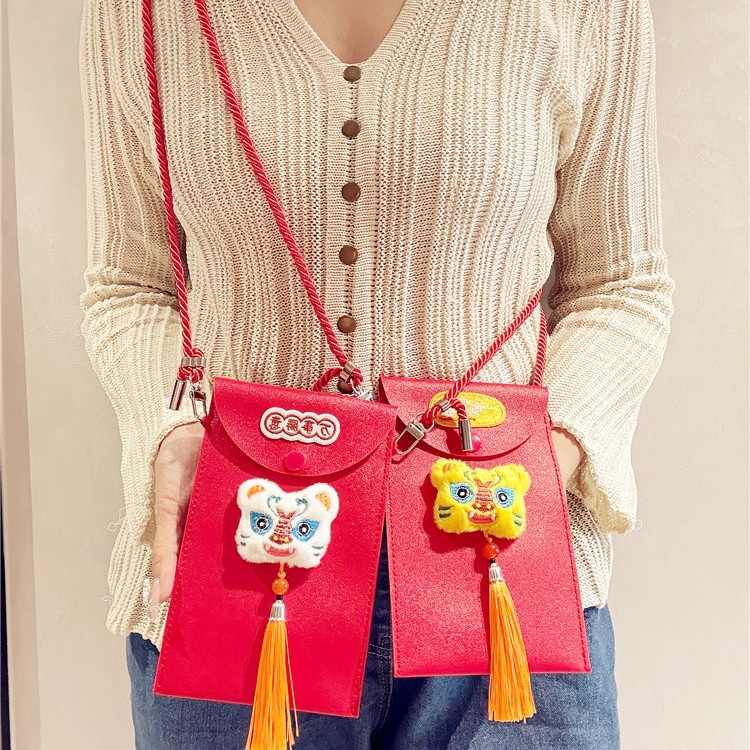 过年拜年压岁钱喜庆毛绒利是封带挂绳手机包醒狮流苏通用万元红包