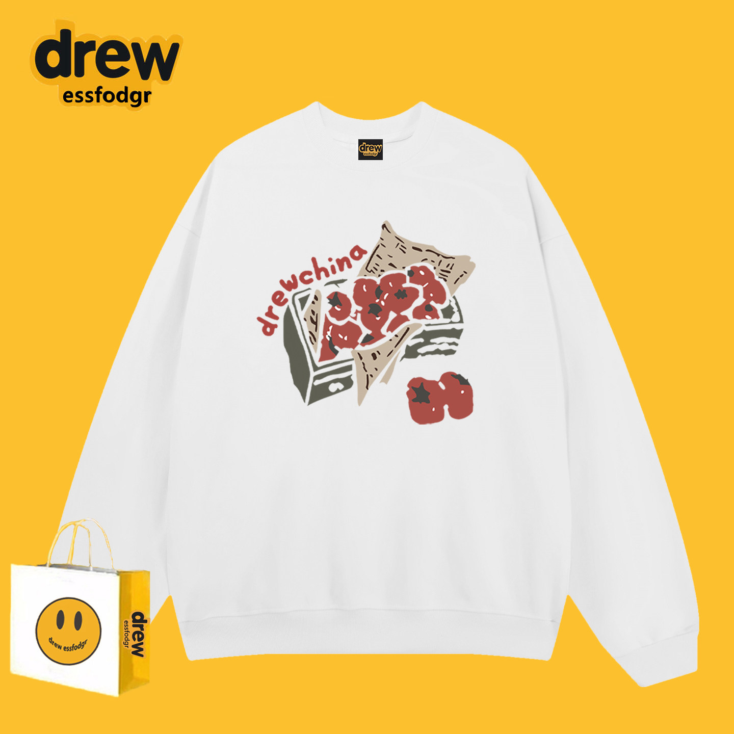 Drew潮牌番茄涂鸦印花圆领卫衣