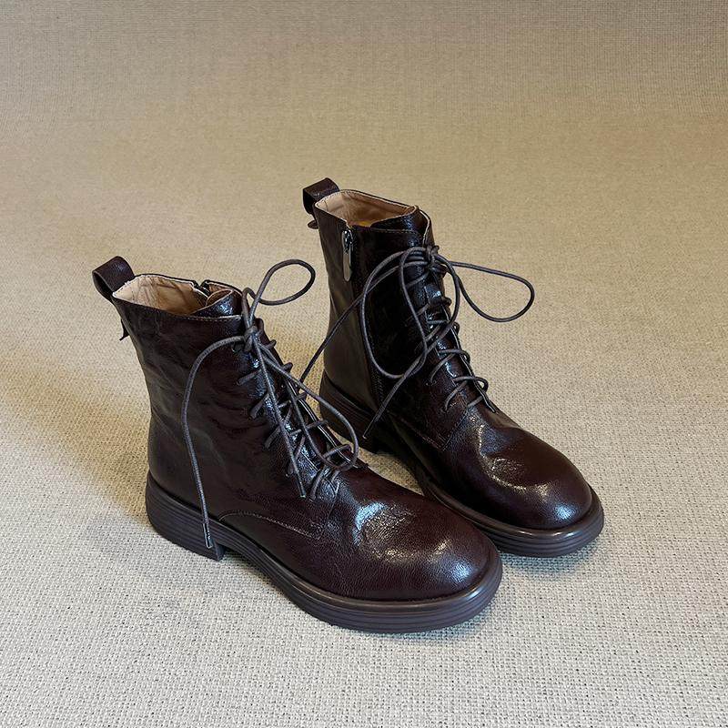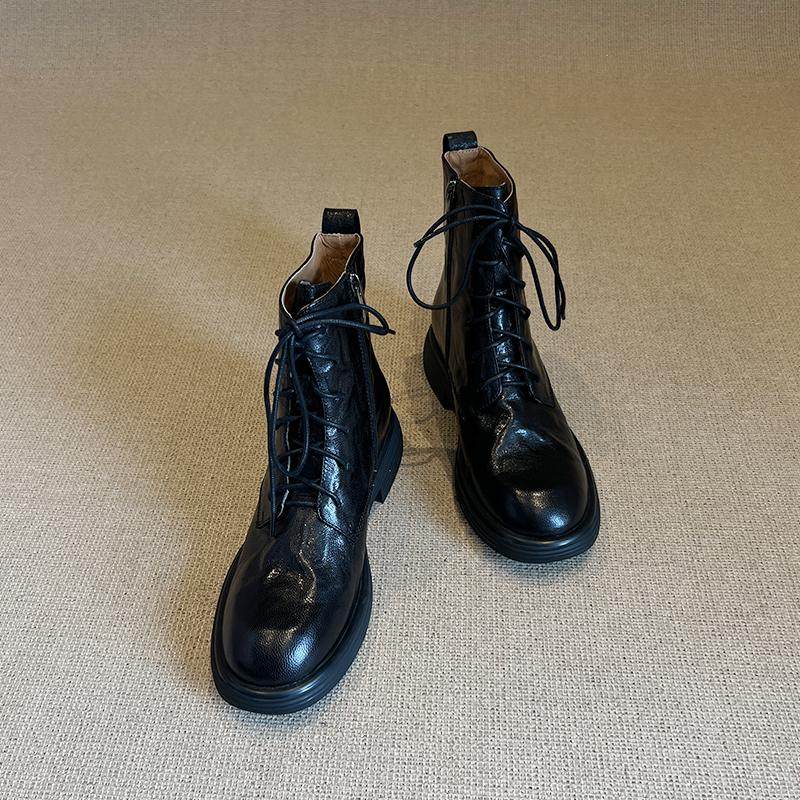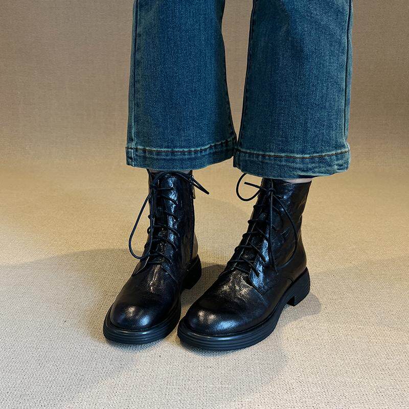软羊皮厚底系带短靴女英伦风2025秋冬新款百搭平底马丁靴女单靴子