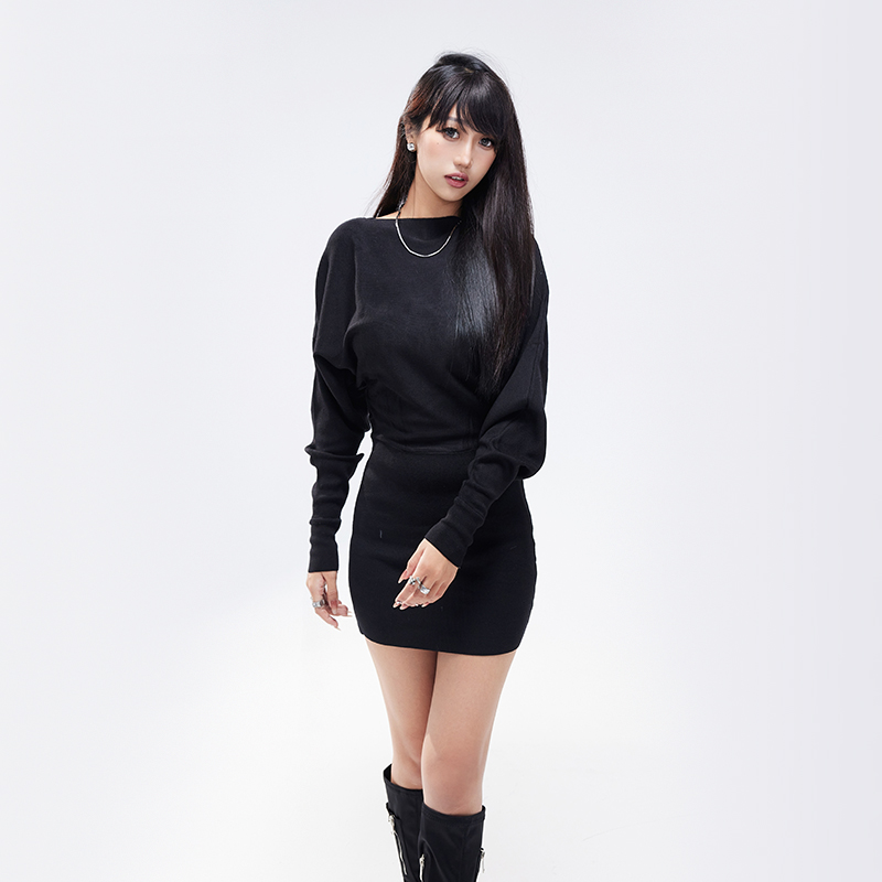 kilonova收腰连衣裙女复古性感辣妹一字领蝙蝠袖秋冬内搭打底短裙