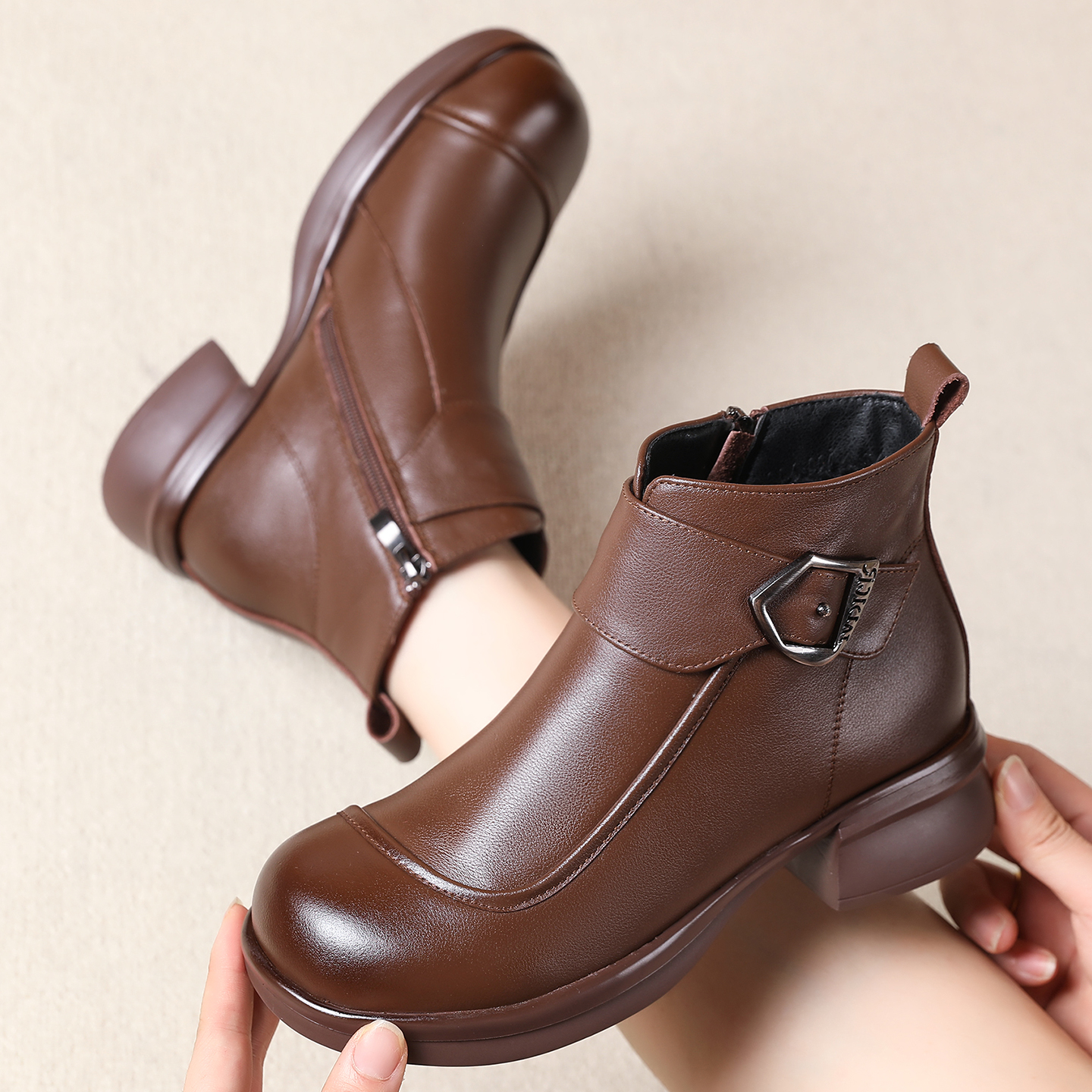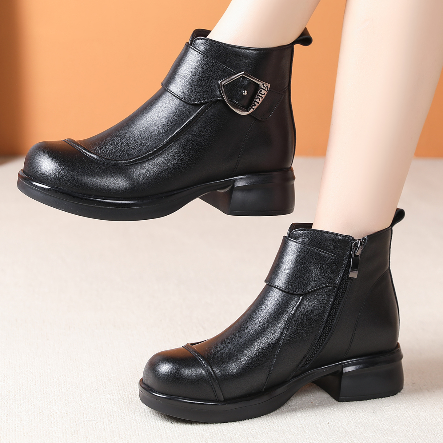 真皮粗跟马丁靴女秋冬舒适软底短靴大码短筒女靴保暖加绒妈妈棉鞋