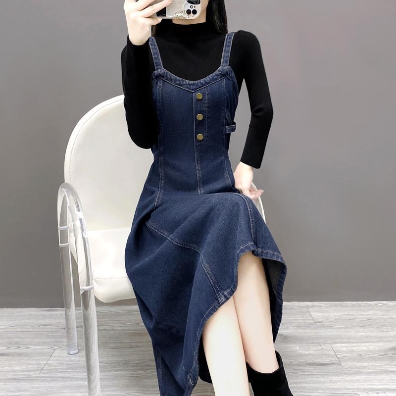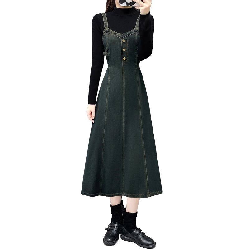 春秋加大码中长裙新款百搭宽松收腰背带长裙牛仔吊带a字连衣裙潮