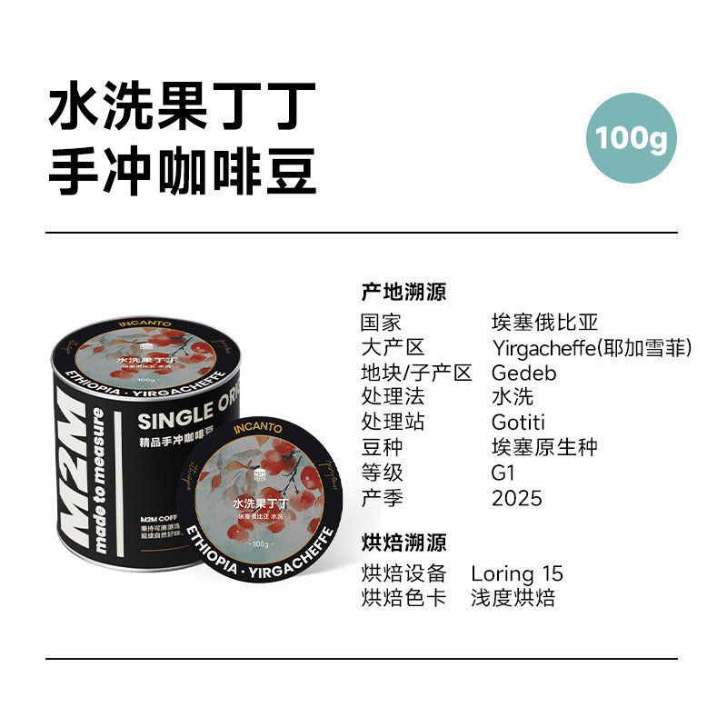 M2M水洗果丁丁 佛手柑甘蔗埃塞水洗G1耶加雪菲手冲黑咖啡豆粉100g