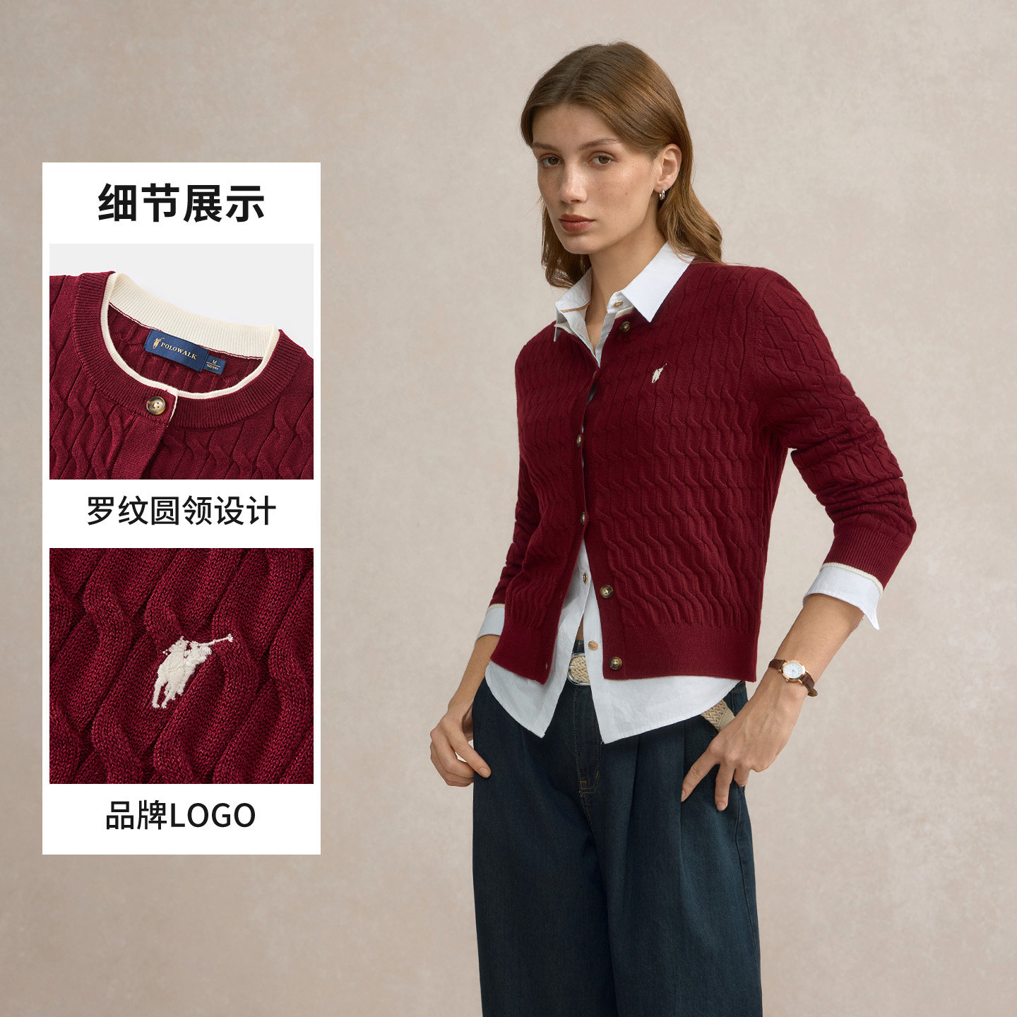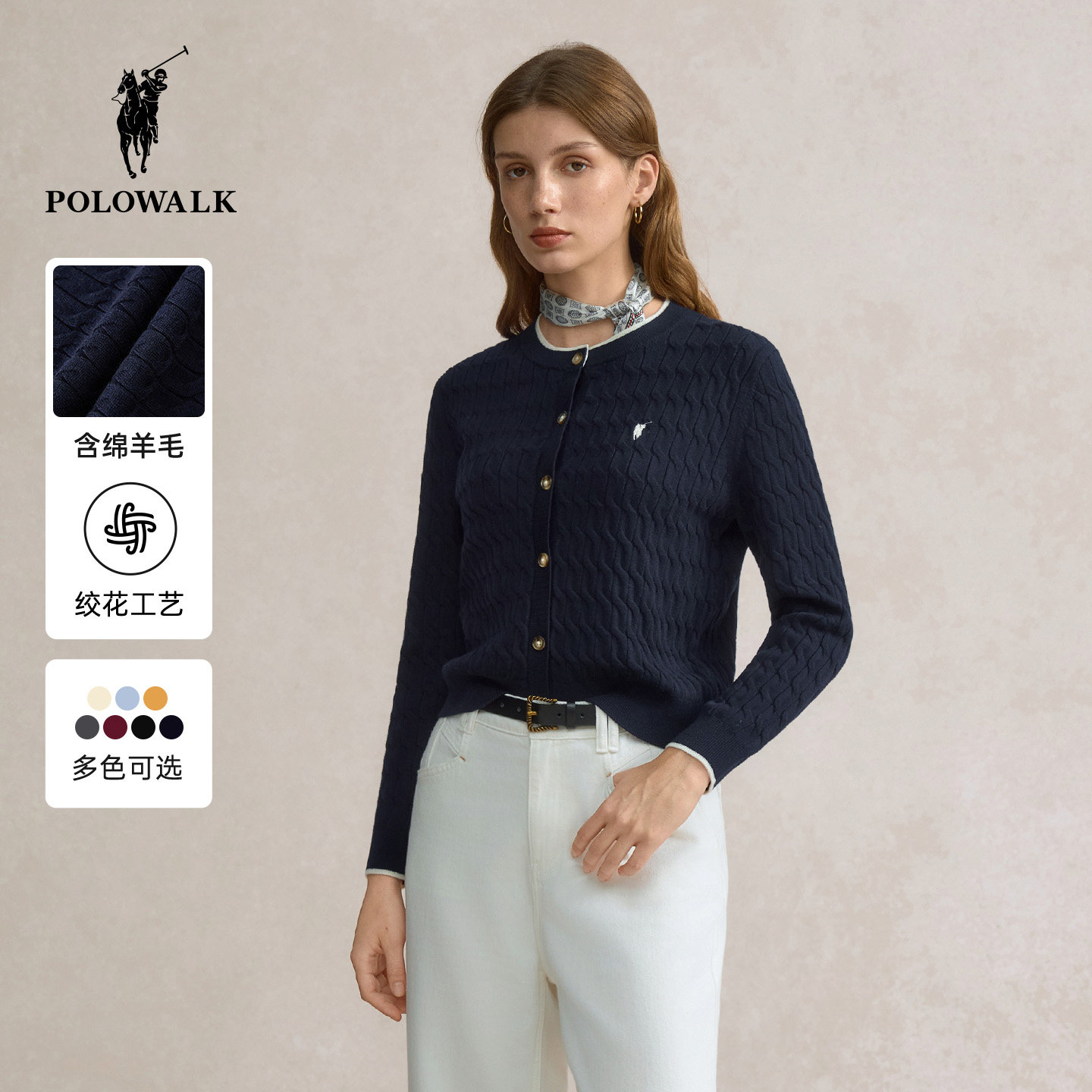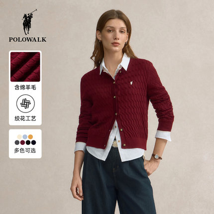 【特惠】POLOWALK长袖针织衫女秋冬新款百搭针织开衫绞花圆领毛衣