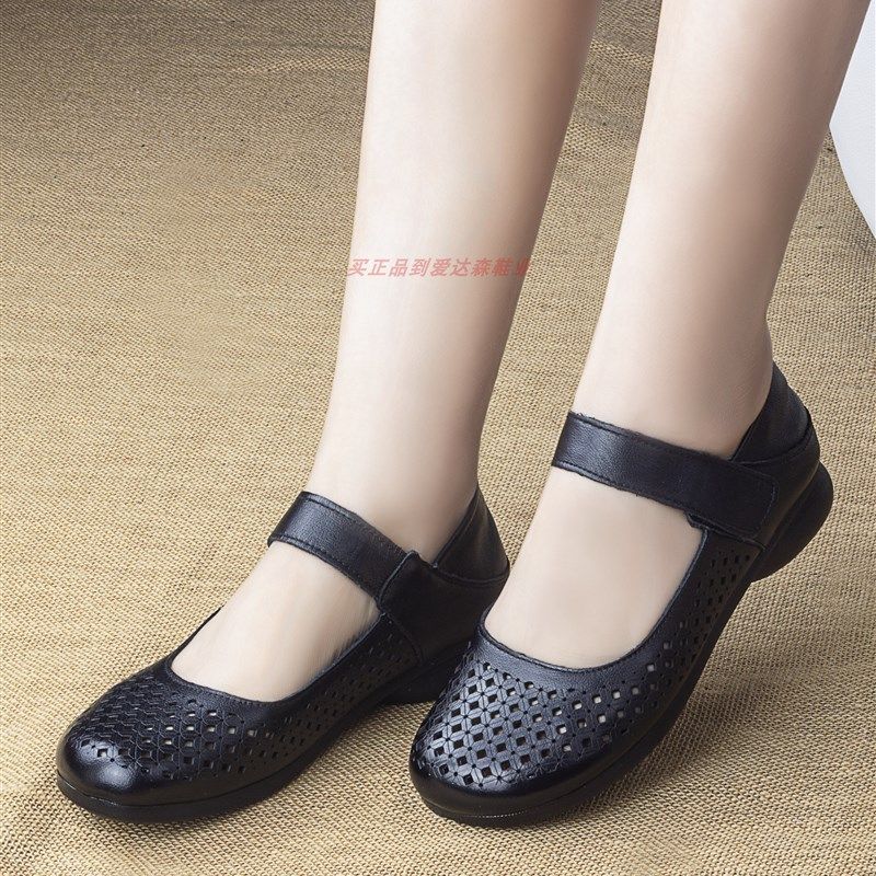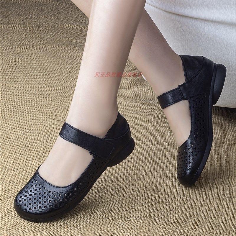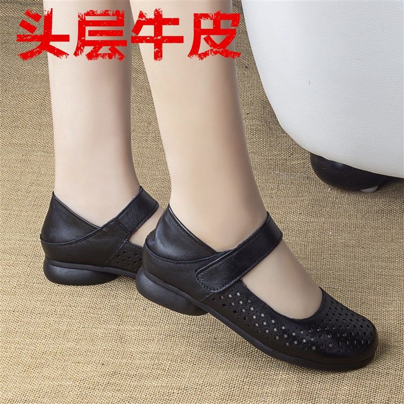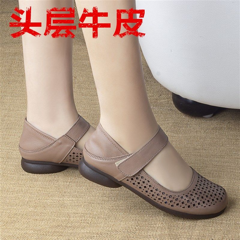 夏老太太女鞋真皮凉鞋低跟妈妈鞋软底中老年洞洞鞋镂空皮鞋2厘米