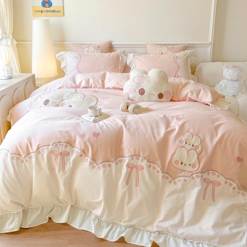 少女全棉磨毛奶油兔子刺绣四件套儿童可爱被套公主风纯棉床单床品