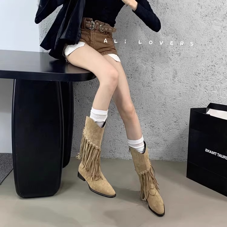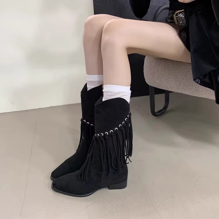 美拉德流苏短靴女2025秋冬新款靴子粗跟中筒靴复古绒面西部牛仔靴