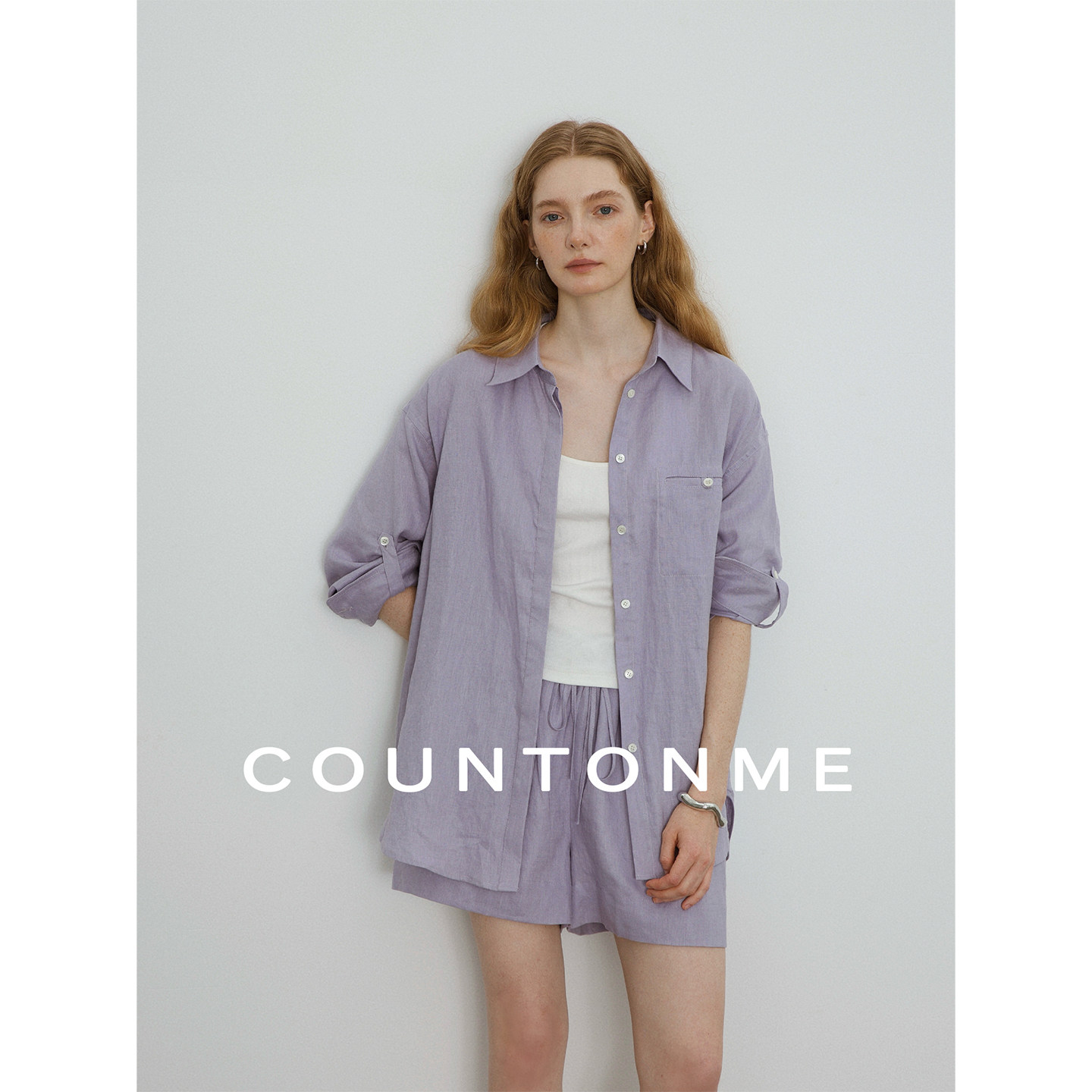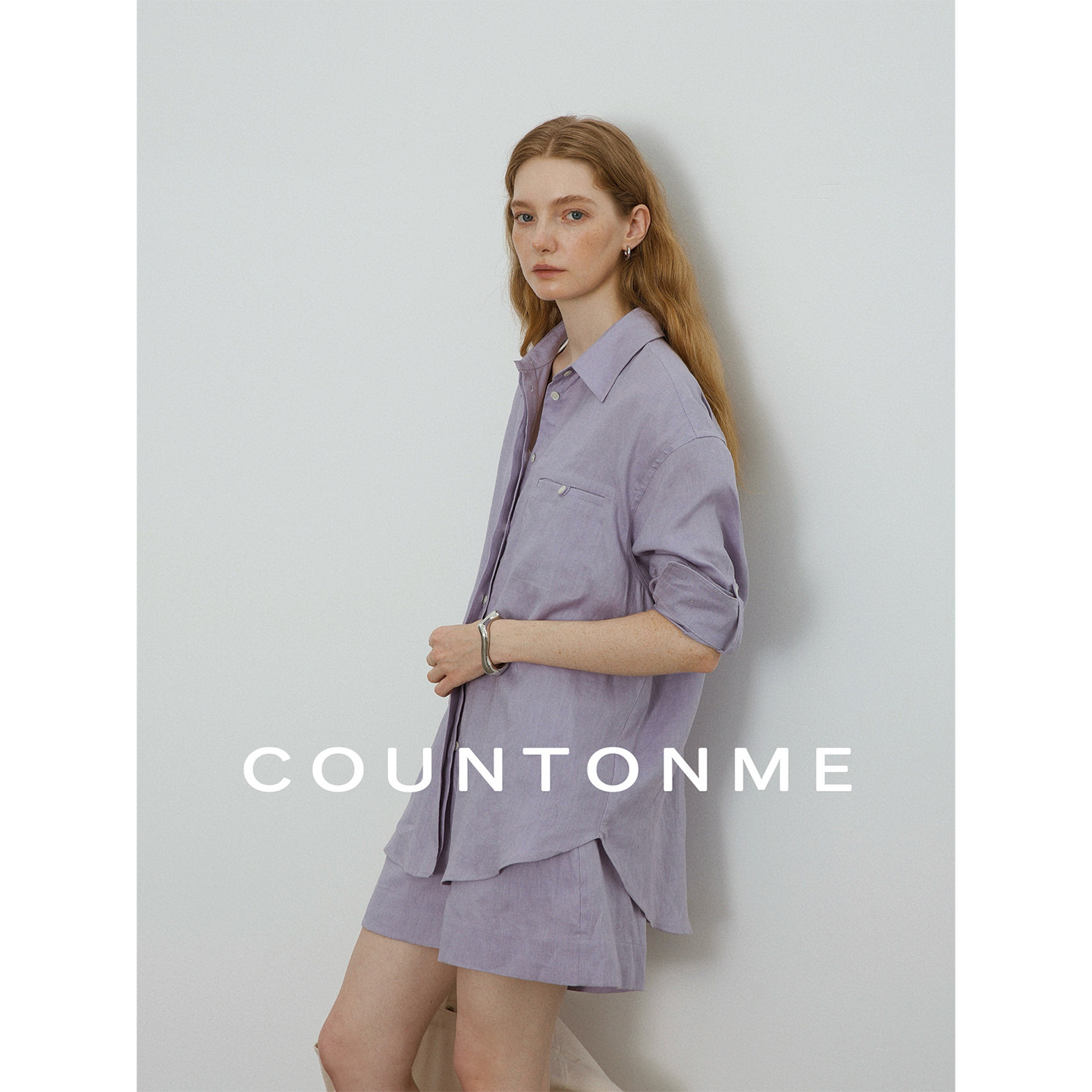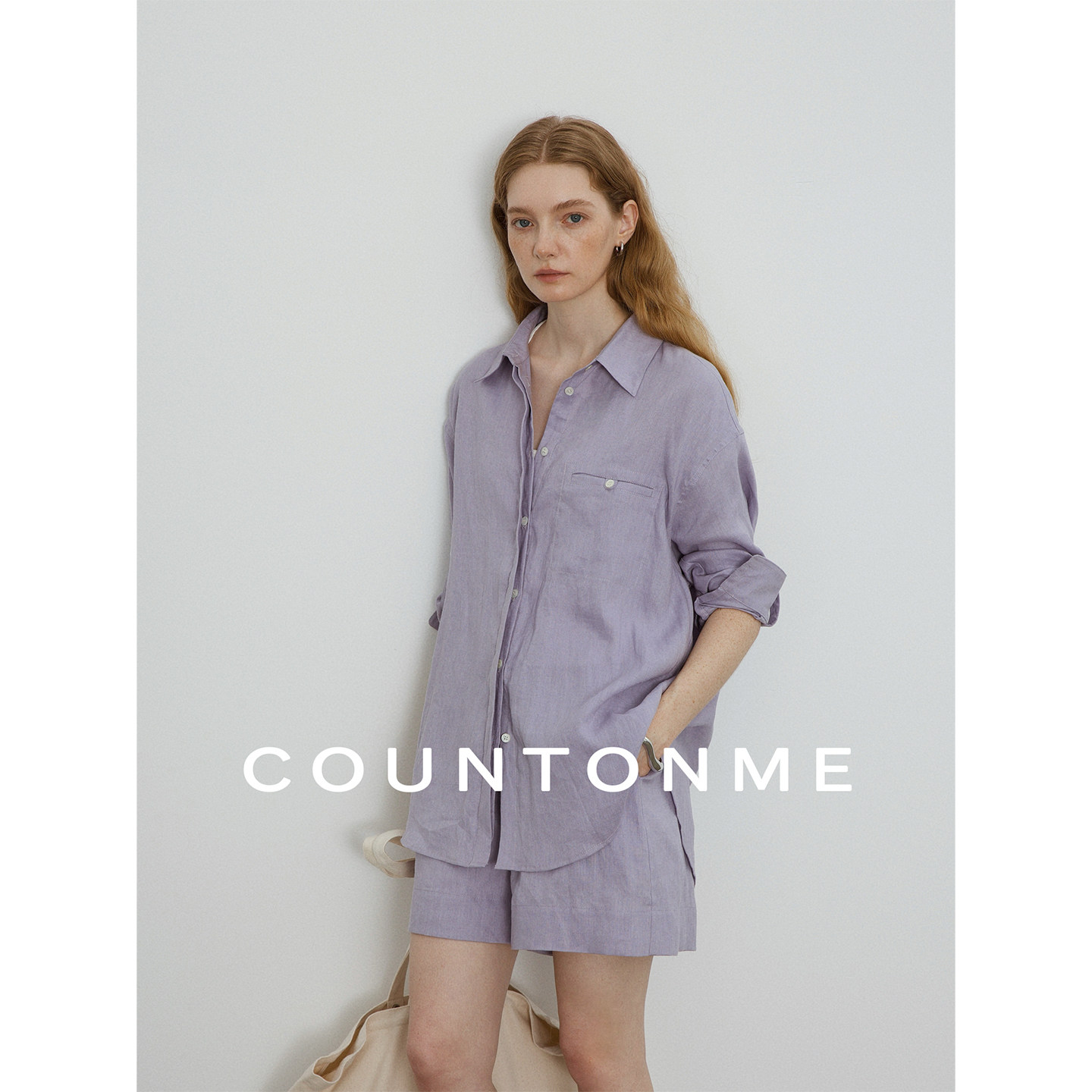 COUNTONME 薰衣草淡紫100%亚麻廓形衬衫短裤套装