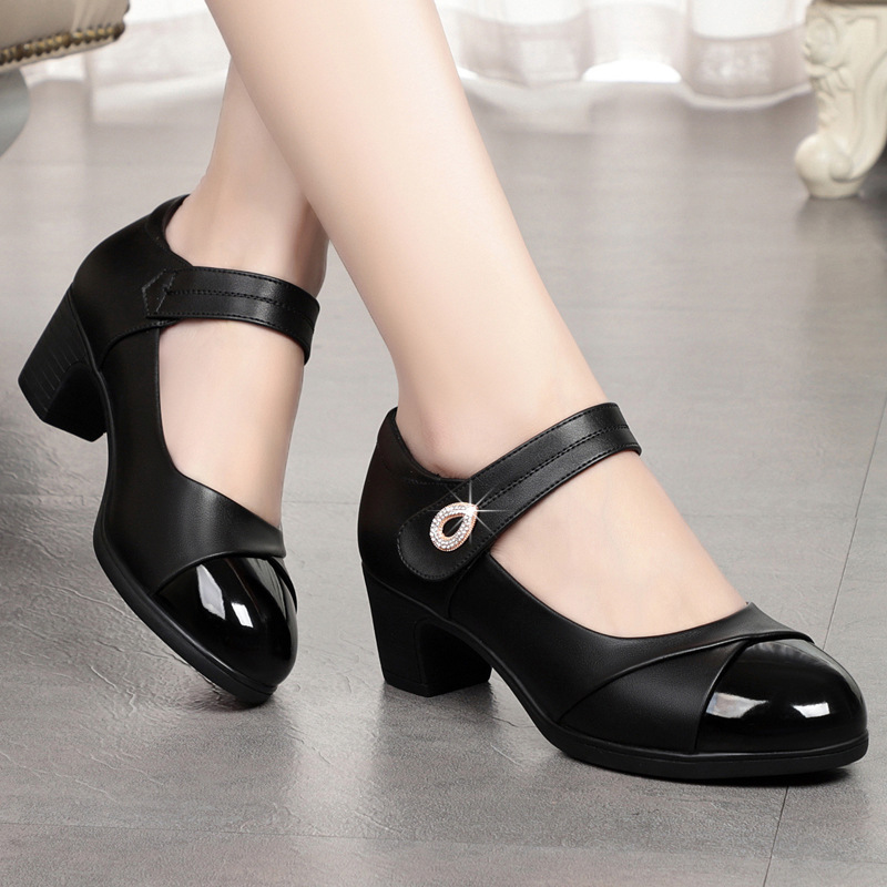 秋季软皮鞋软底舒适高跟中跟广场舞一字扣妈妈鞋浅口跳舞单鞋女鞋