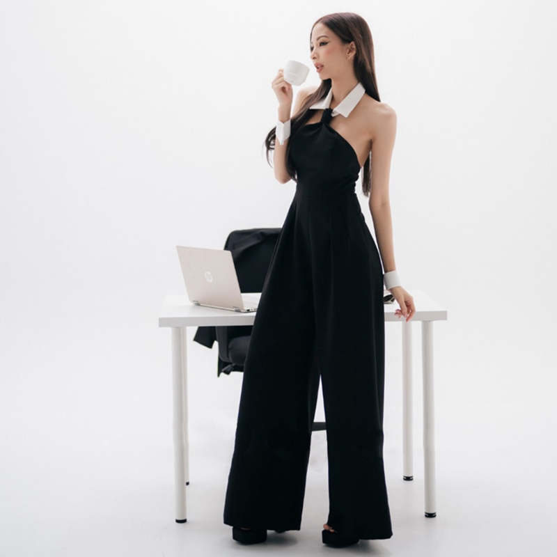 衬衫领露肩条纹修身阔腿连体裤女