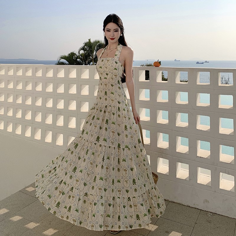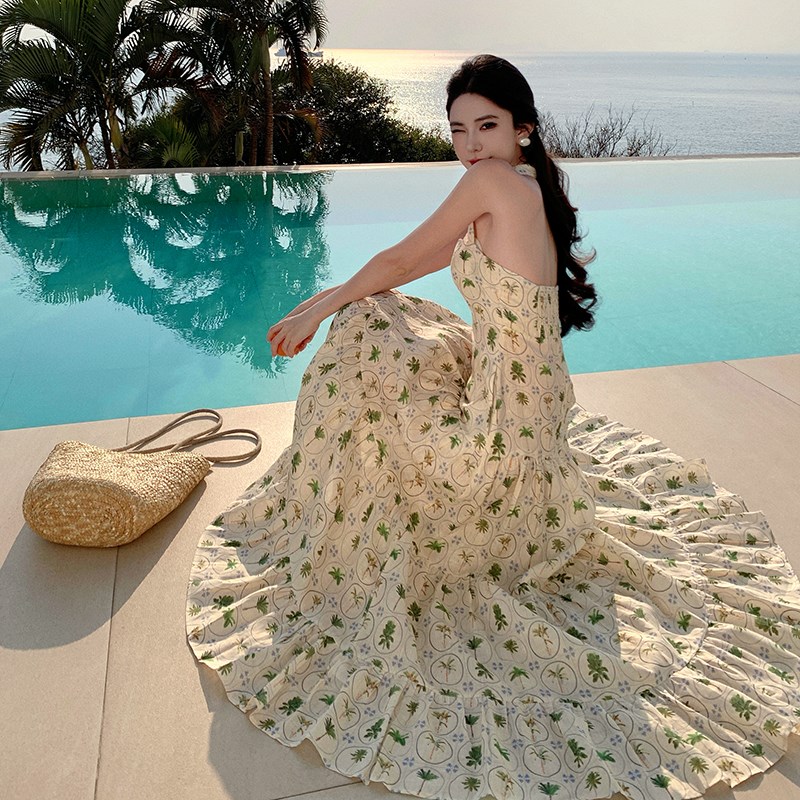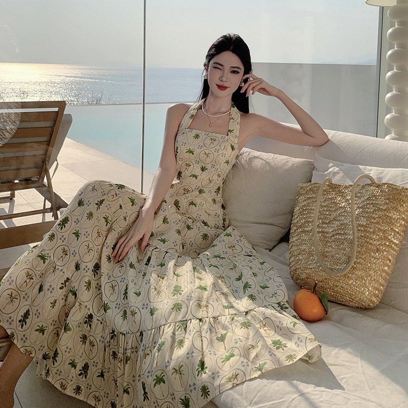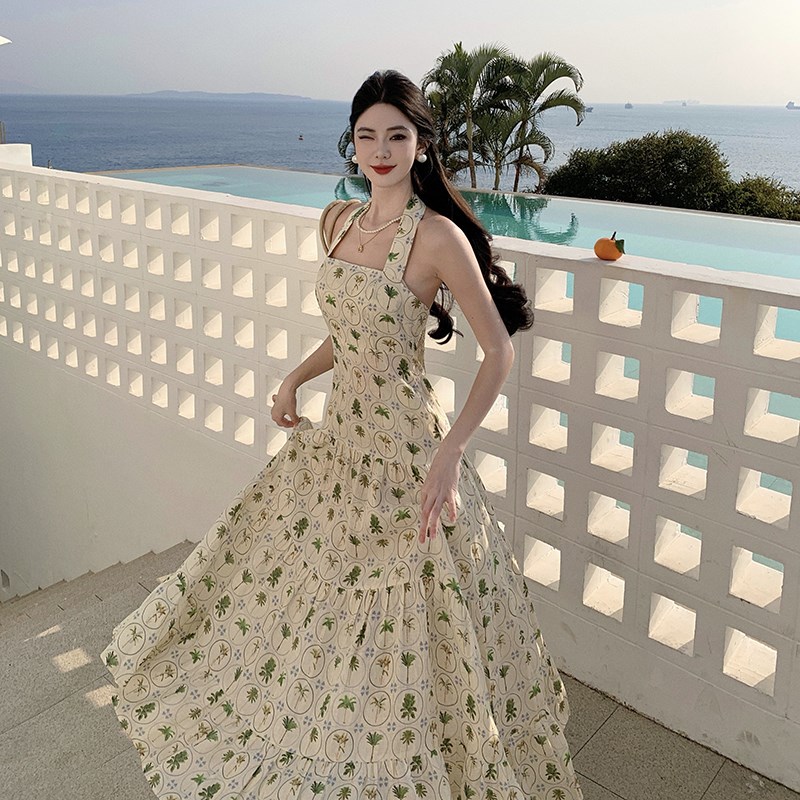 现货速发三亚海边穿搭高级感法式精致印花复古挂脖连衣裙沙滩度假