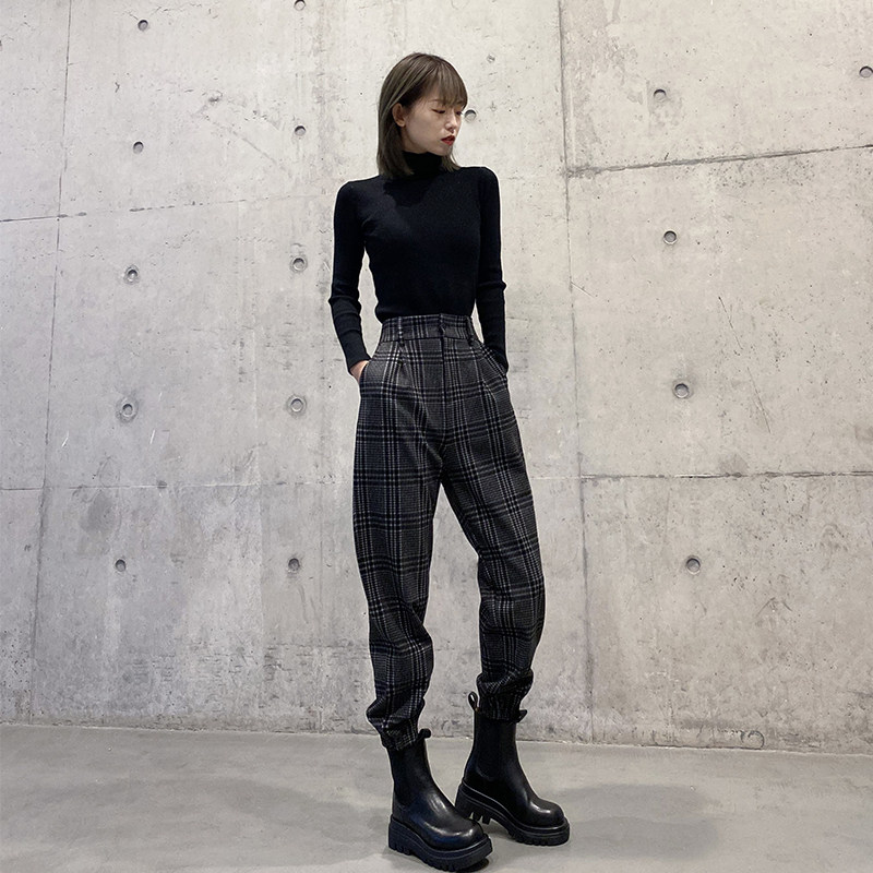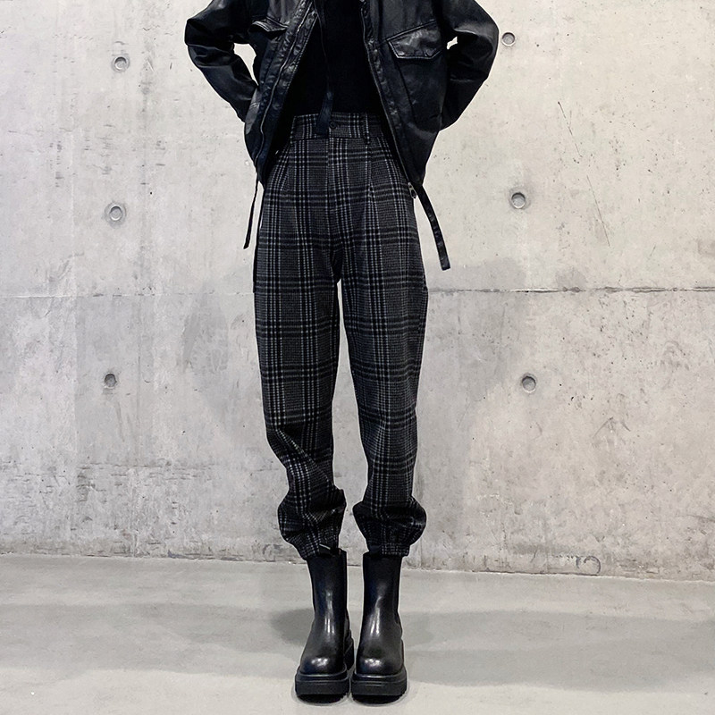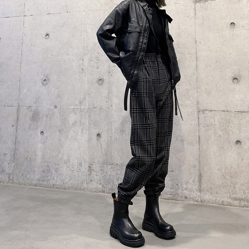 格子裤女秋冬季新款毛呢工装束脚裤高腰显瘦配马丁靴休闲裤哈伦裤