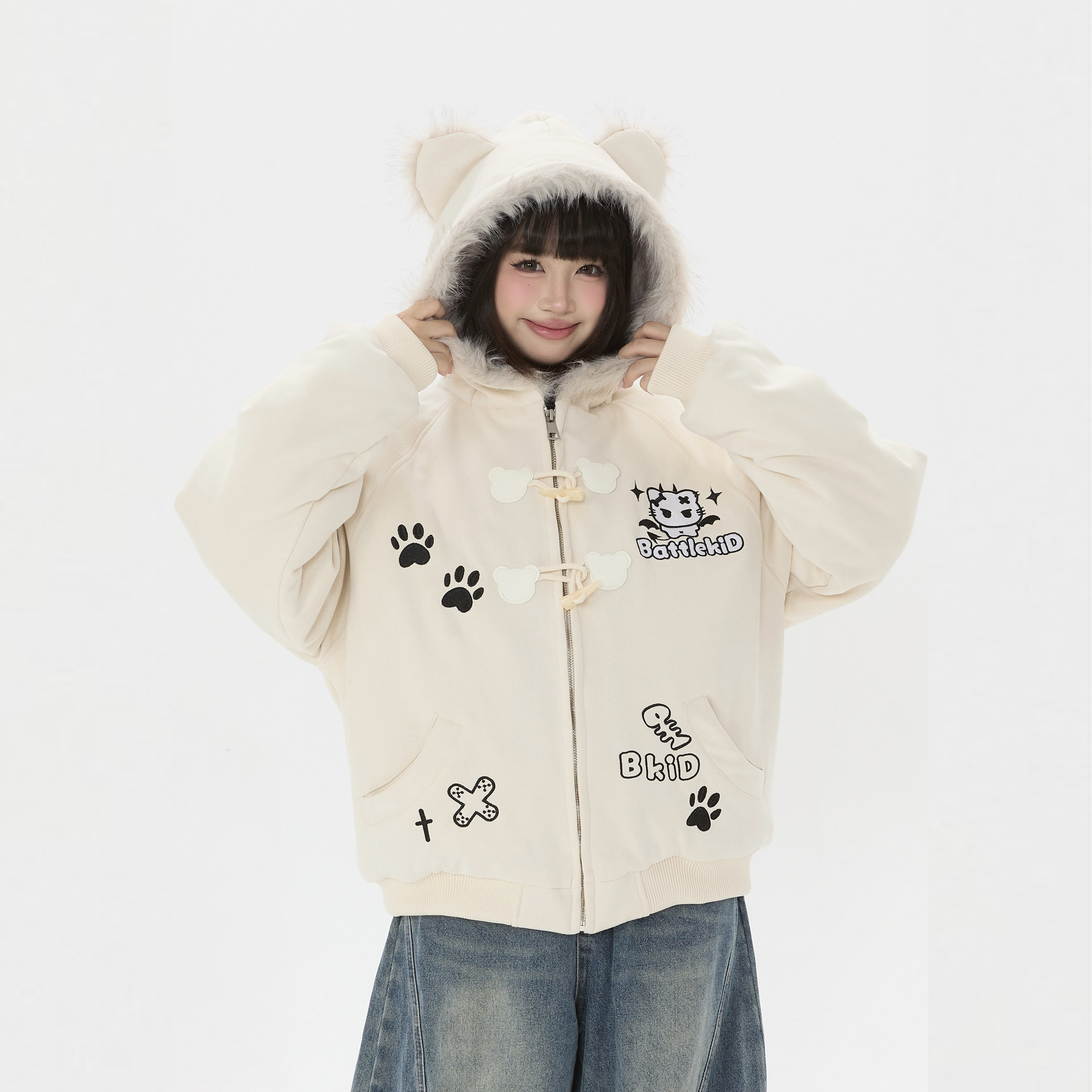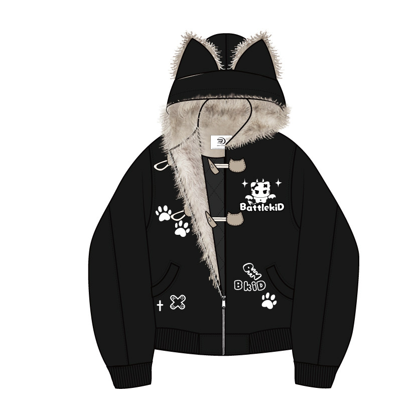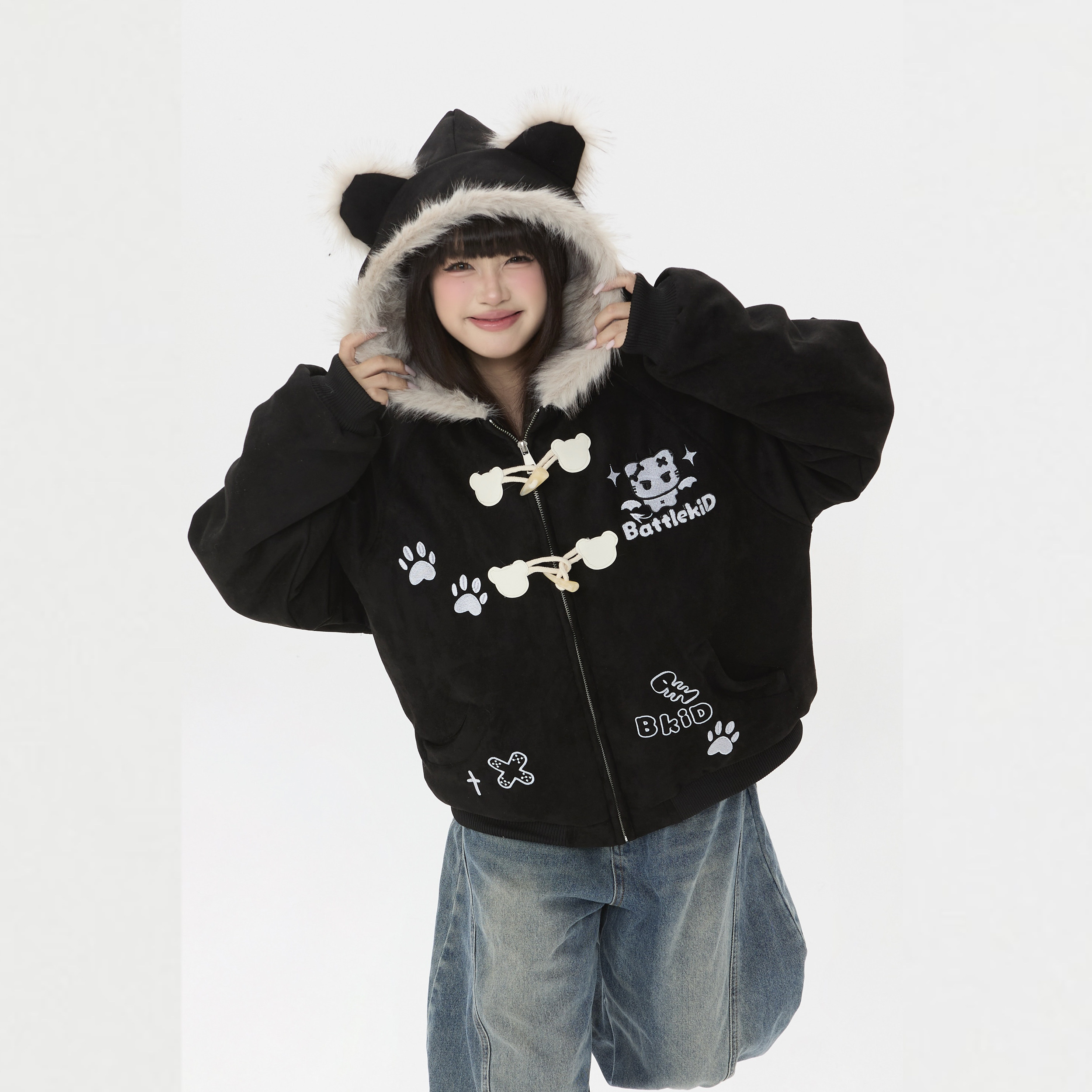 【零碎岛屿】国潮原创猫咪刺绣座山雕毛领棉服男女冬季麂皮绒外套