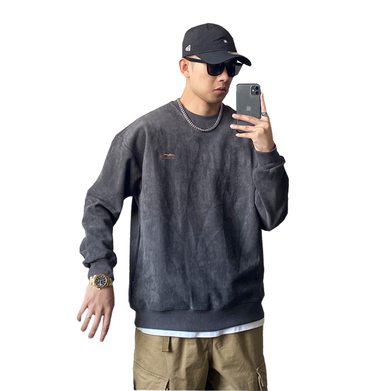 春秋季美式休闲痞帅重磅刺绣麂皮绒圆领卫衣男宽松百搭长袖上衣潮