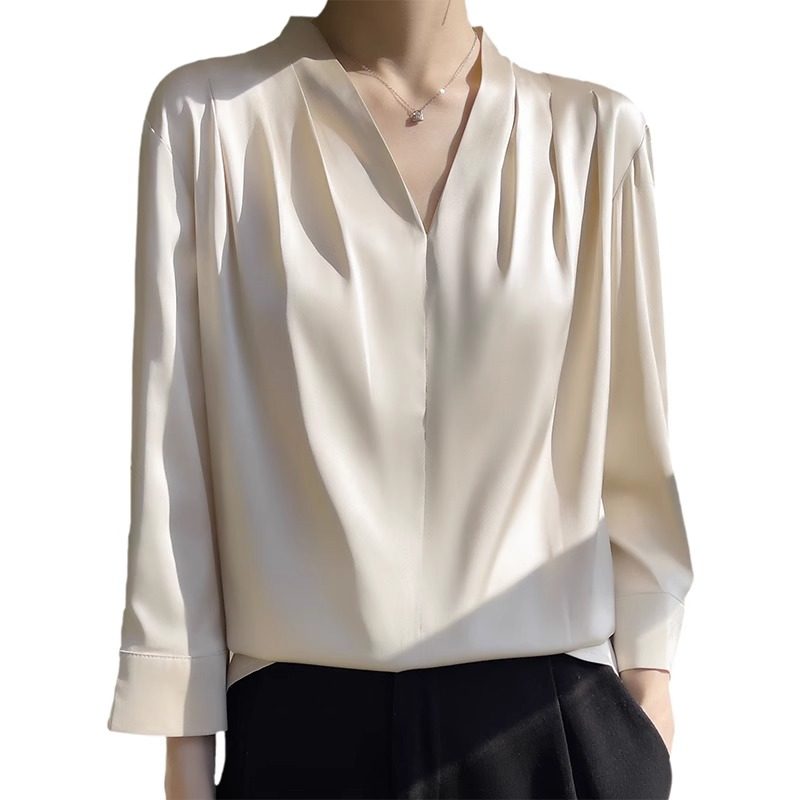 高级感法式真丝缎面衬衫女春季V领时尚气质上衣职业装桑蚕丝小衫