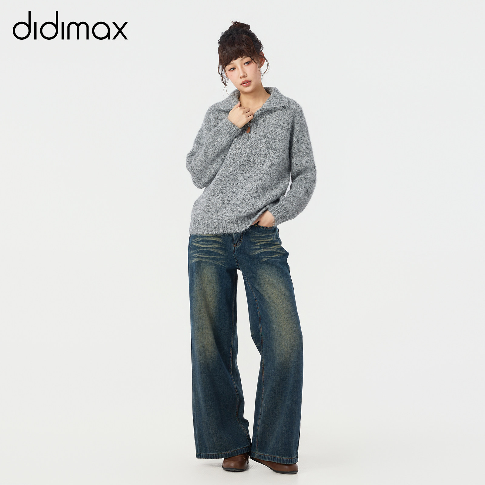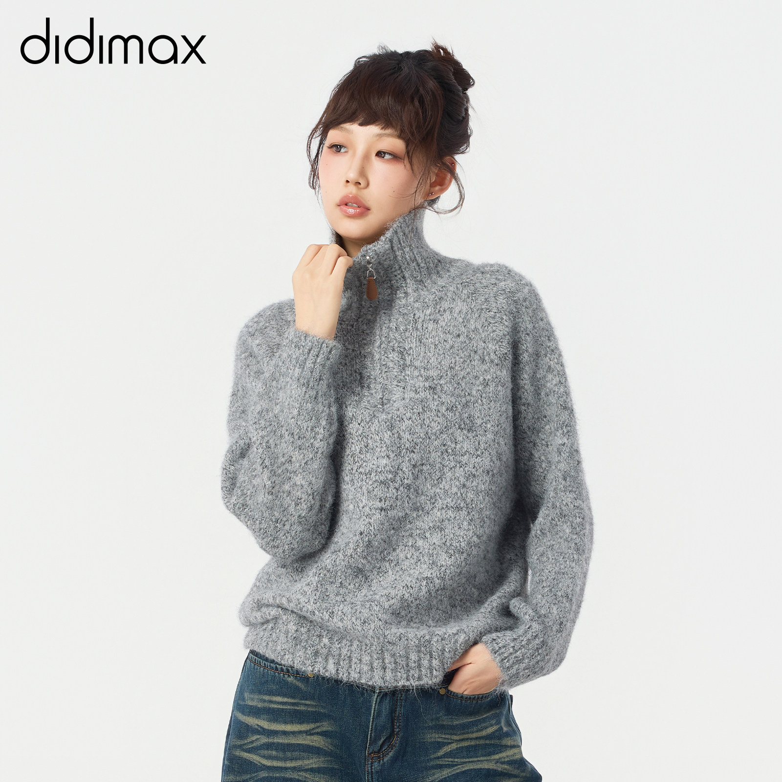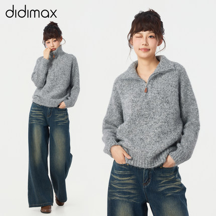 didimax冬季新款高领半拉链毛衣 灰色粗针织毛衣宽松女上衣W26495