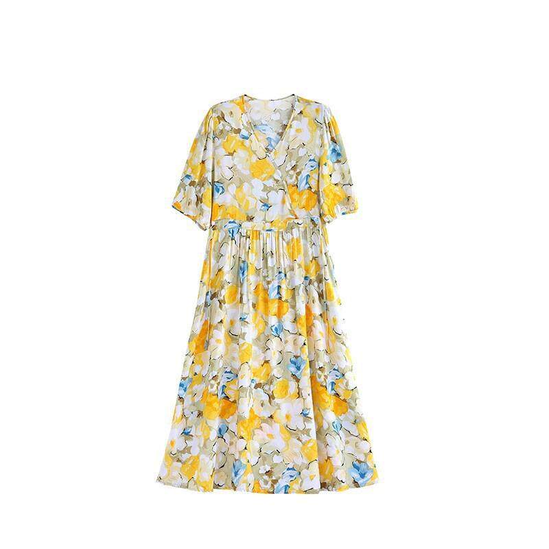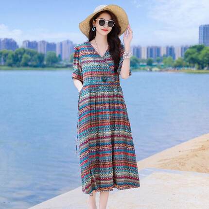 棉绸连衣裙高端精致印花新款显瘦女优雅气质法式妈妈裙子沙滩夏季