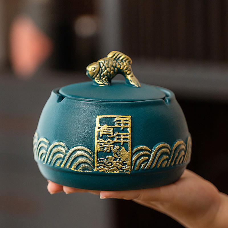 创意年年有余烟灰缸陶瓷带盖防飞灰家用客厅茶桌中式办公室大烟缸