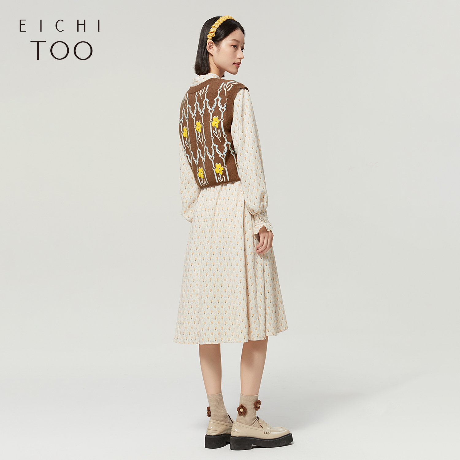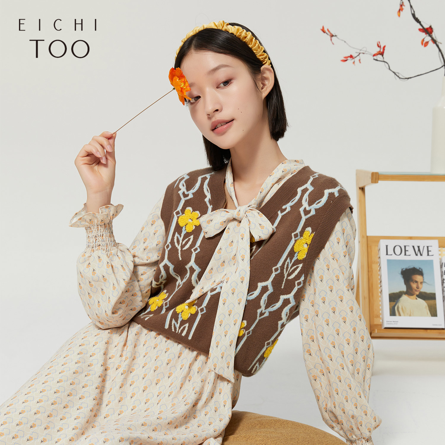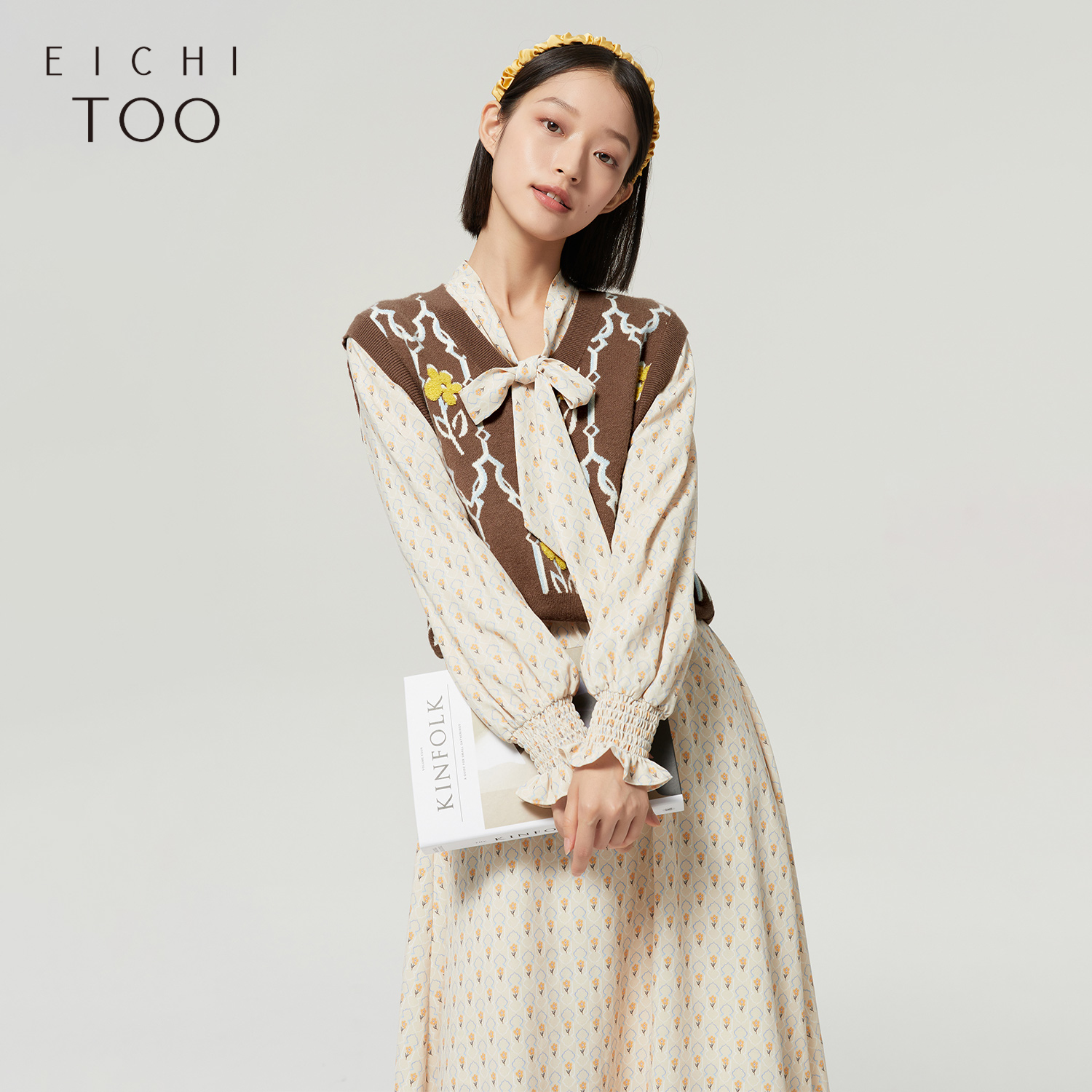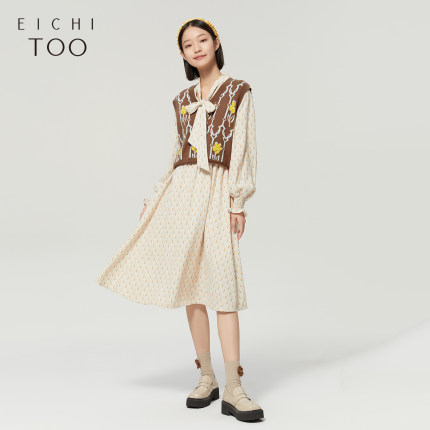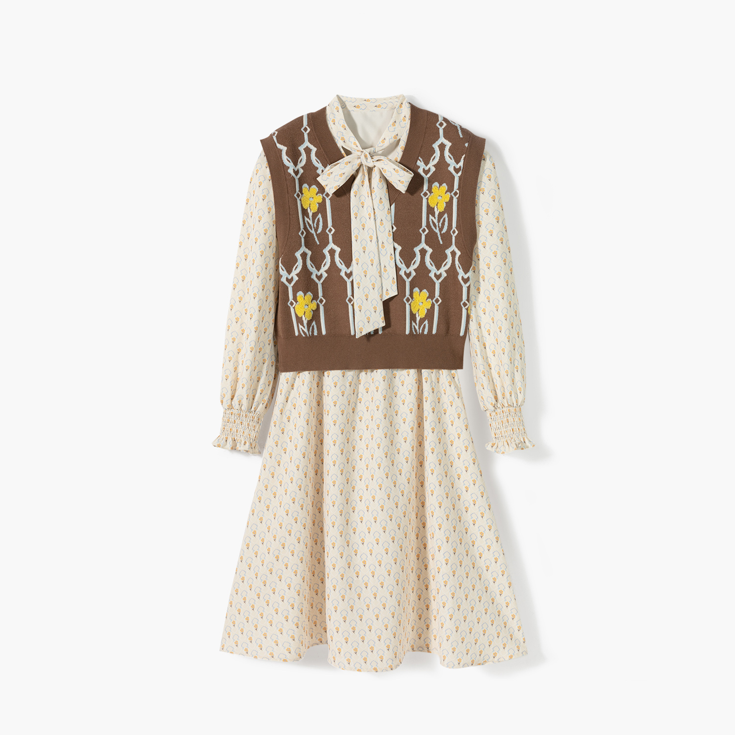 爱居兔秋季女中长裙针织背心搭配飘带领灯笼袖设计两件式连衣裙