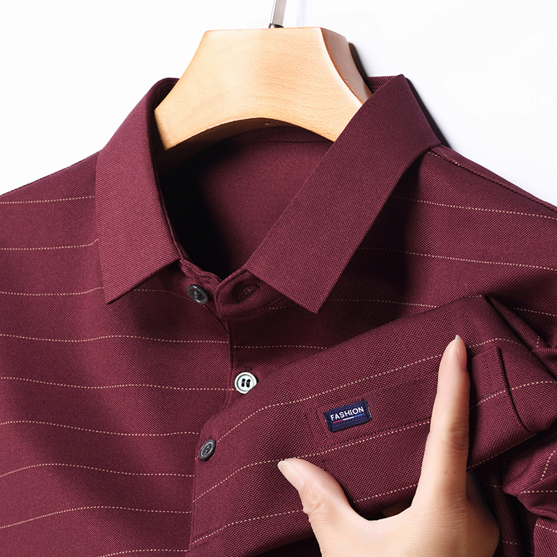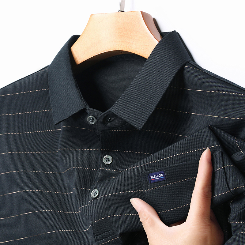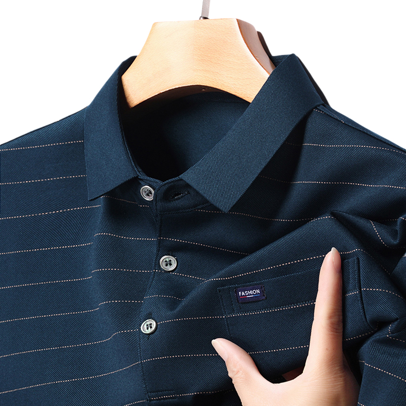 啄木鸟中年男士冰丝polo衫爸爸装翻领短袖t恤宽松条纹真口袋上衣