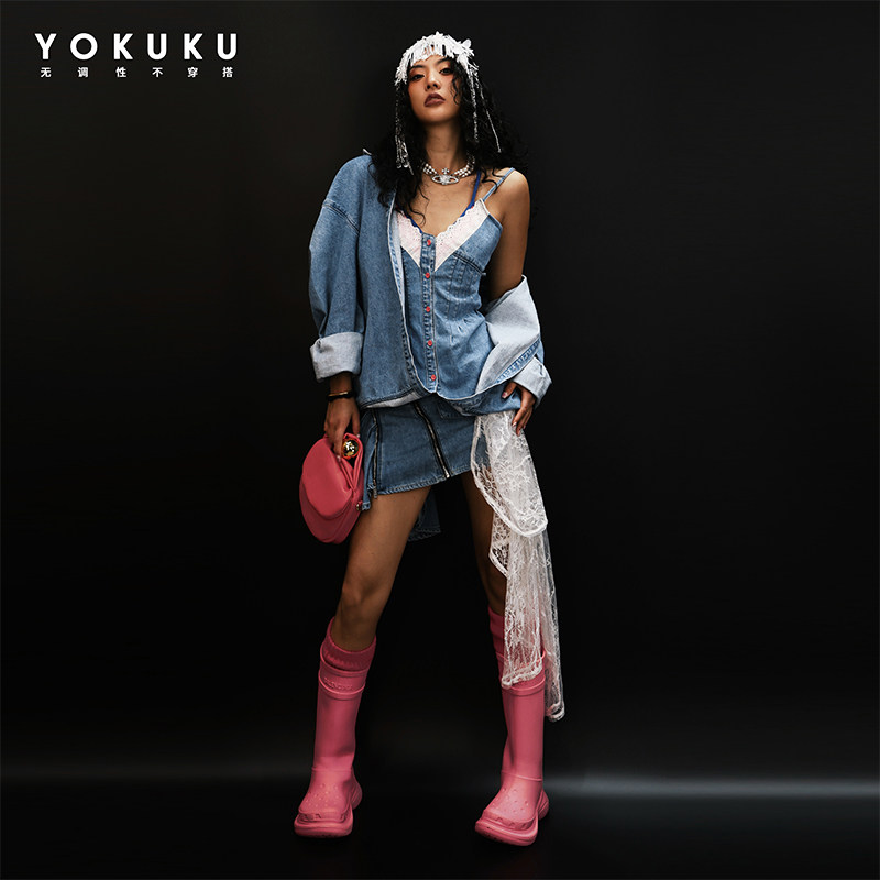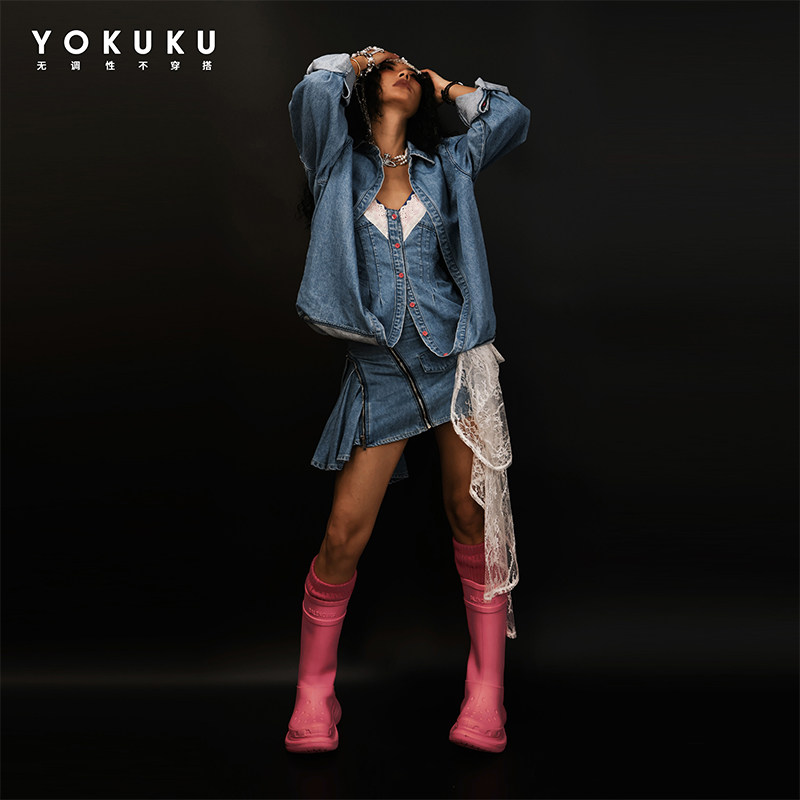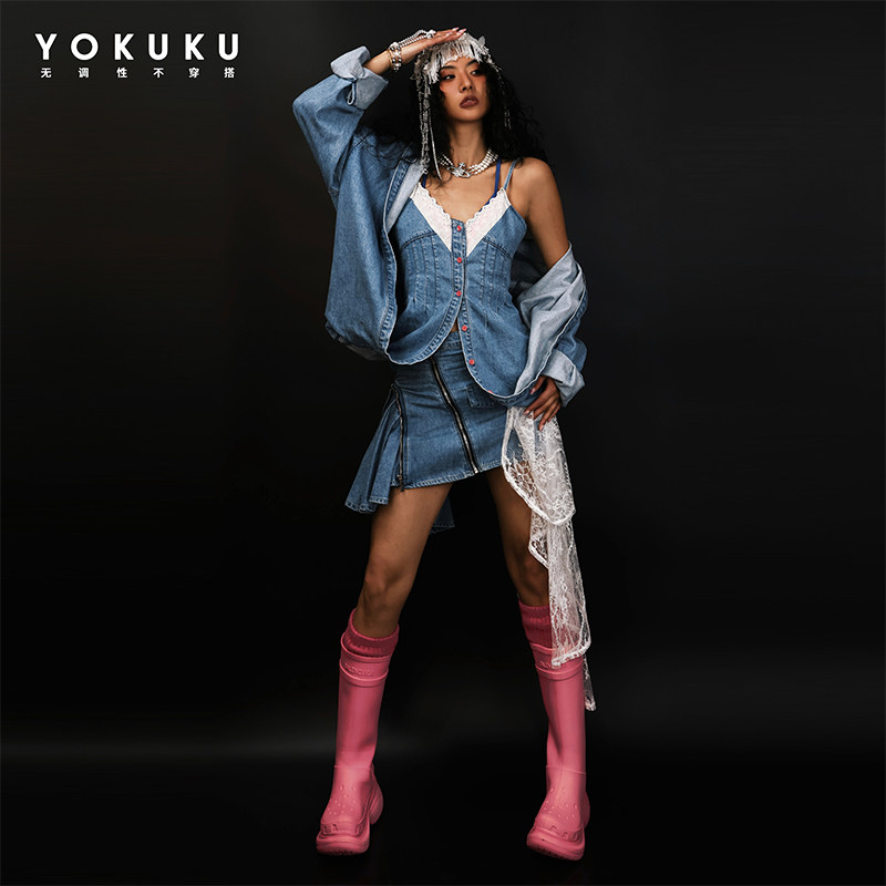 哟酷酷(偏爱与执着)夏季美式不规则牛仔半身裙女蕾丝拼接短裙女