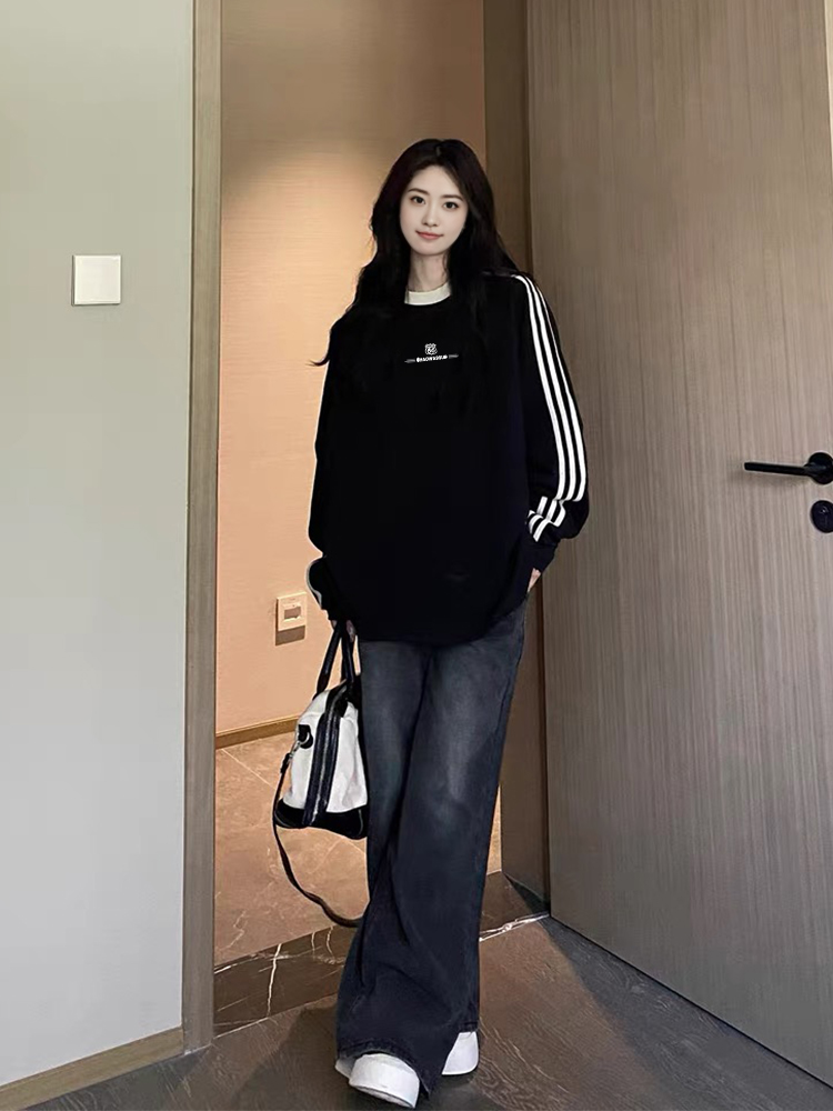 美式潮街复古三条杠圆领秋冬季加绒大码卫衣男女情侣oversize高街