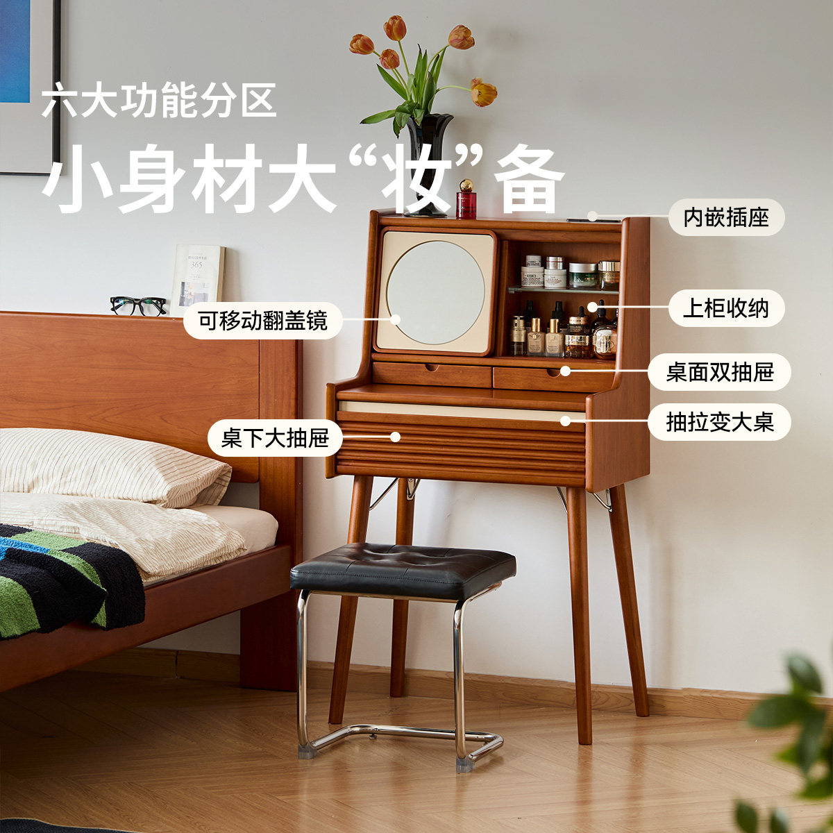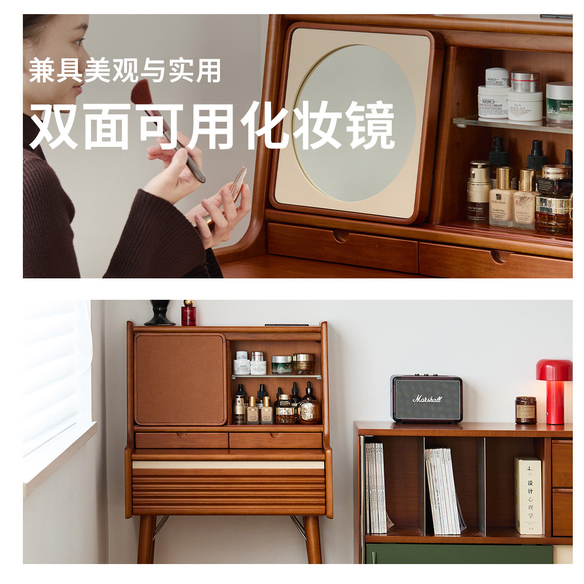 出乎生活小蜗梳妆台实木化妆桌小户型中古风卧室收纳柜一体化妆台