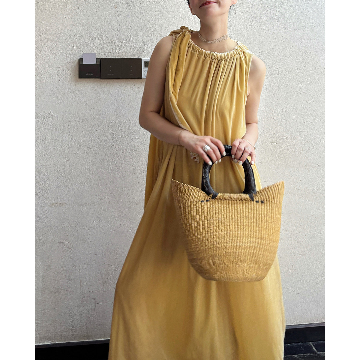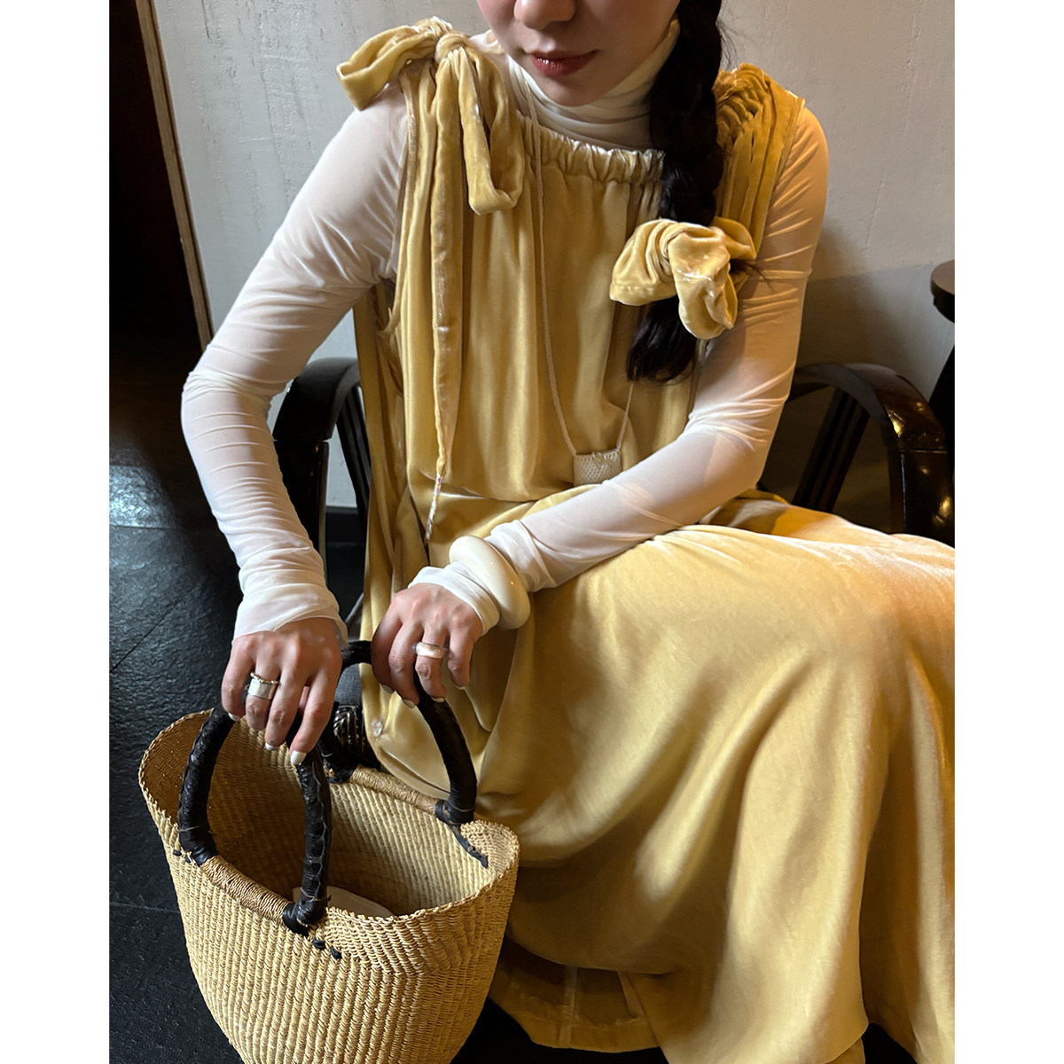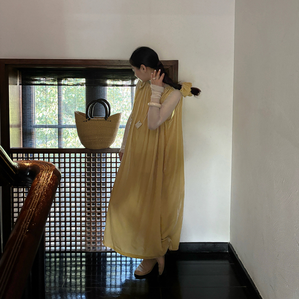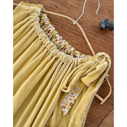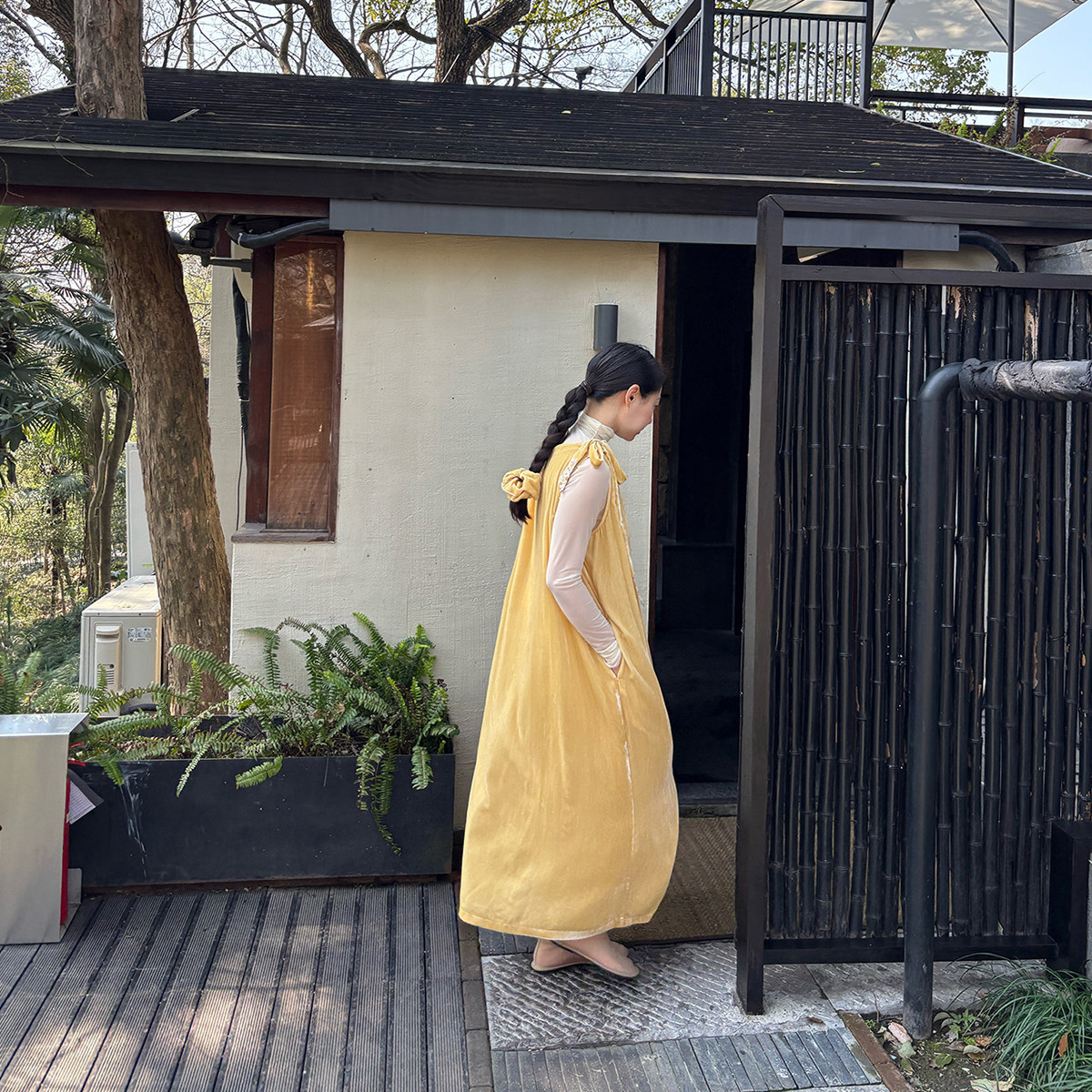 AULDCAT 2025SS 鹅黄色真丝丝绒系带连衣裙 碎花拼布长裙