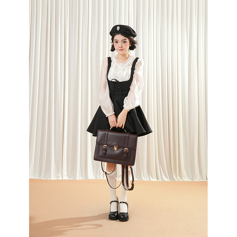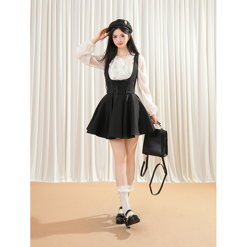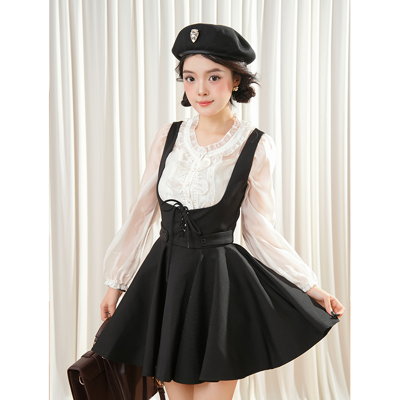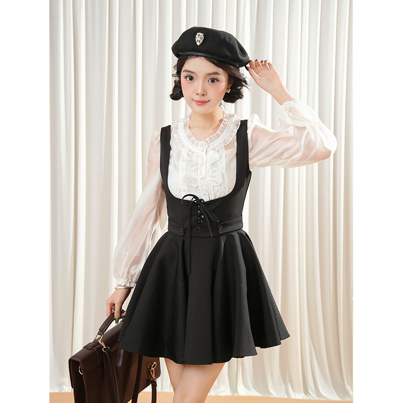 甜心乖乖女 中古秀场花瓣衬衫+系带背带裙两件套法式气质甜美套装
