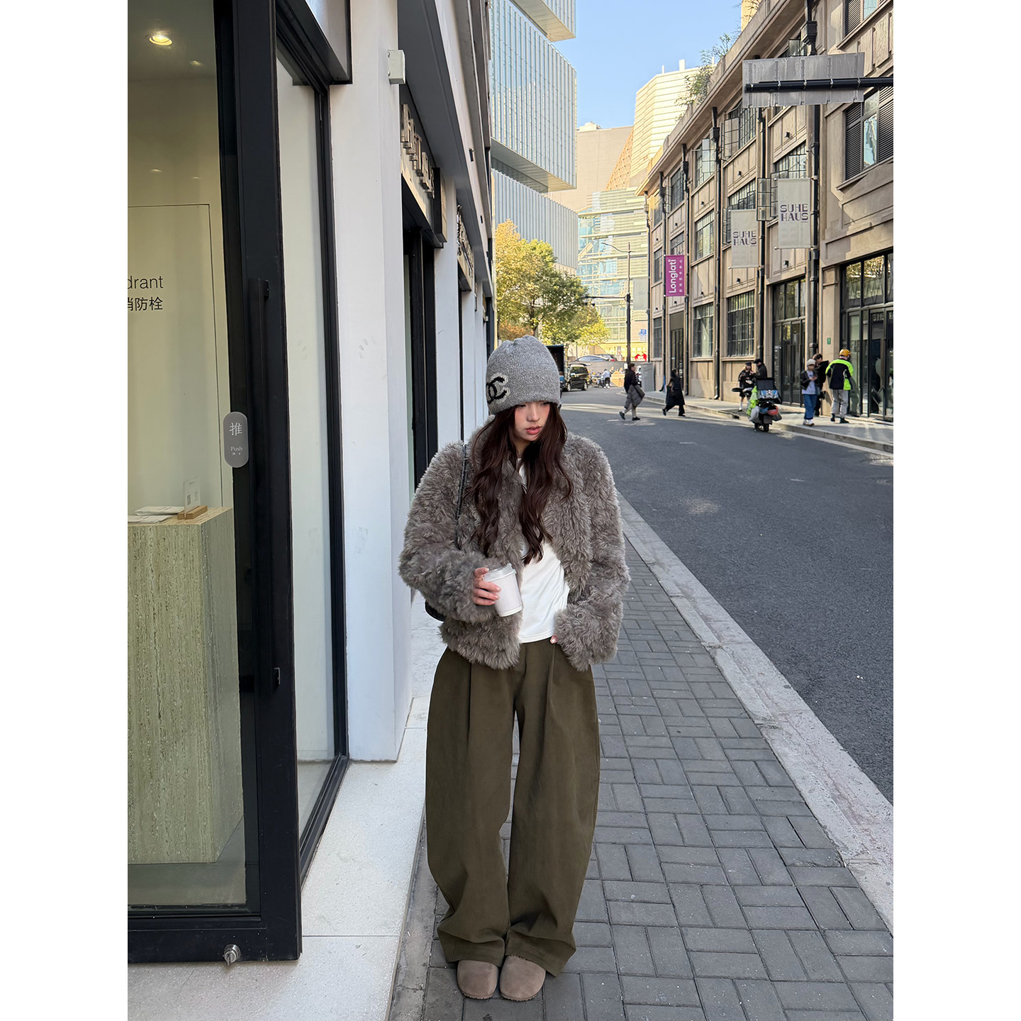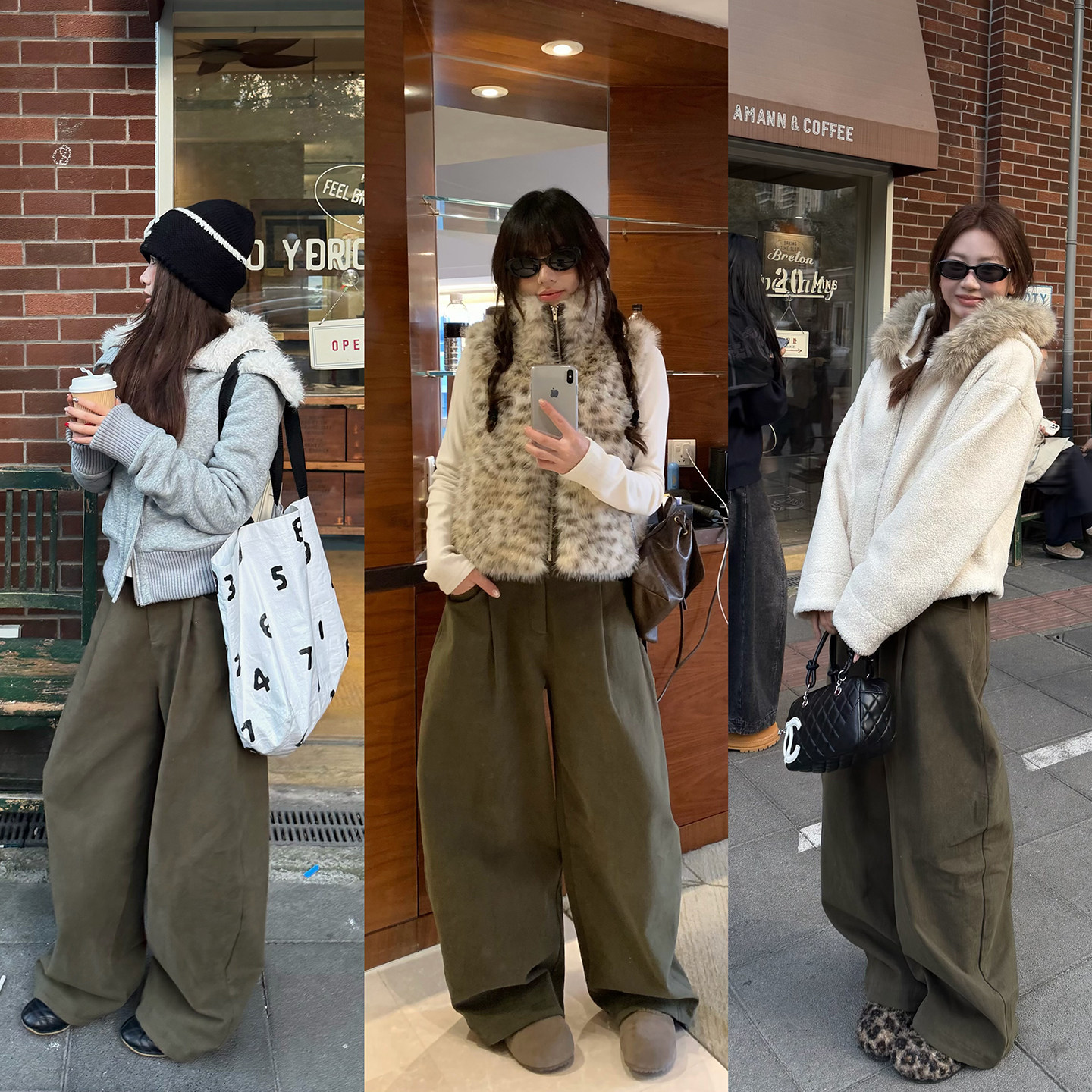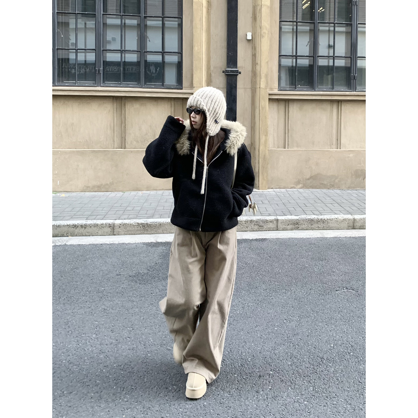 荒荒家 半松紧高腰弯刀裤2025冬季新款慵懒工装直筒阔腿休闲裤女