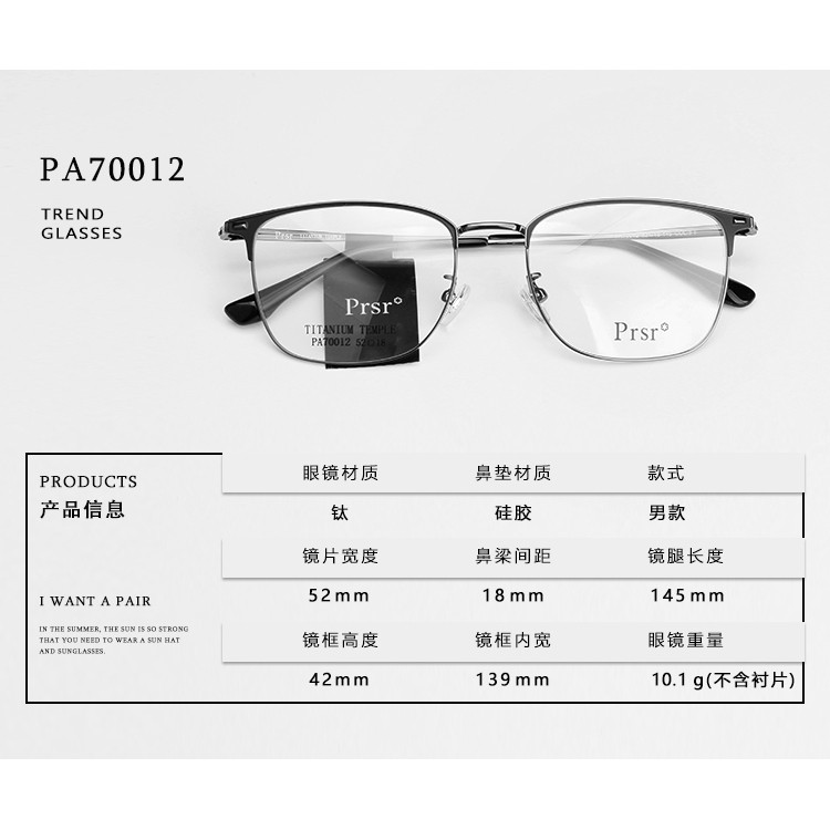 新款帕莎眼镜框架眉毛框配防蓝光近视光学纯钛镜架PA70012网红款