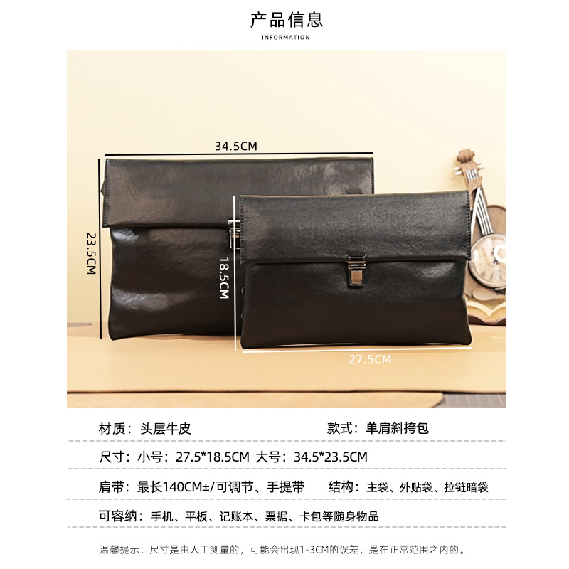 黑色手工植鞣头层牛皮真皮男士单肩斜挎包大容量通勤简约新款包包