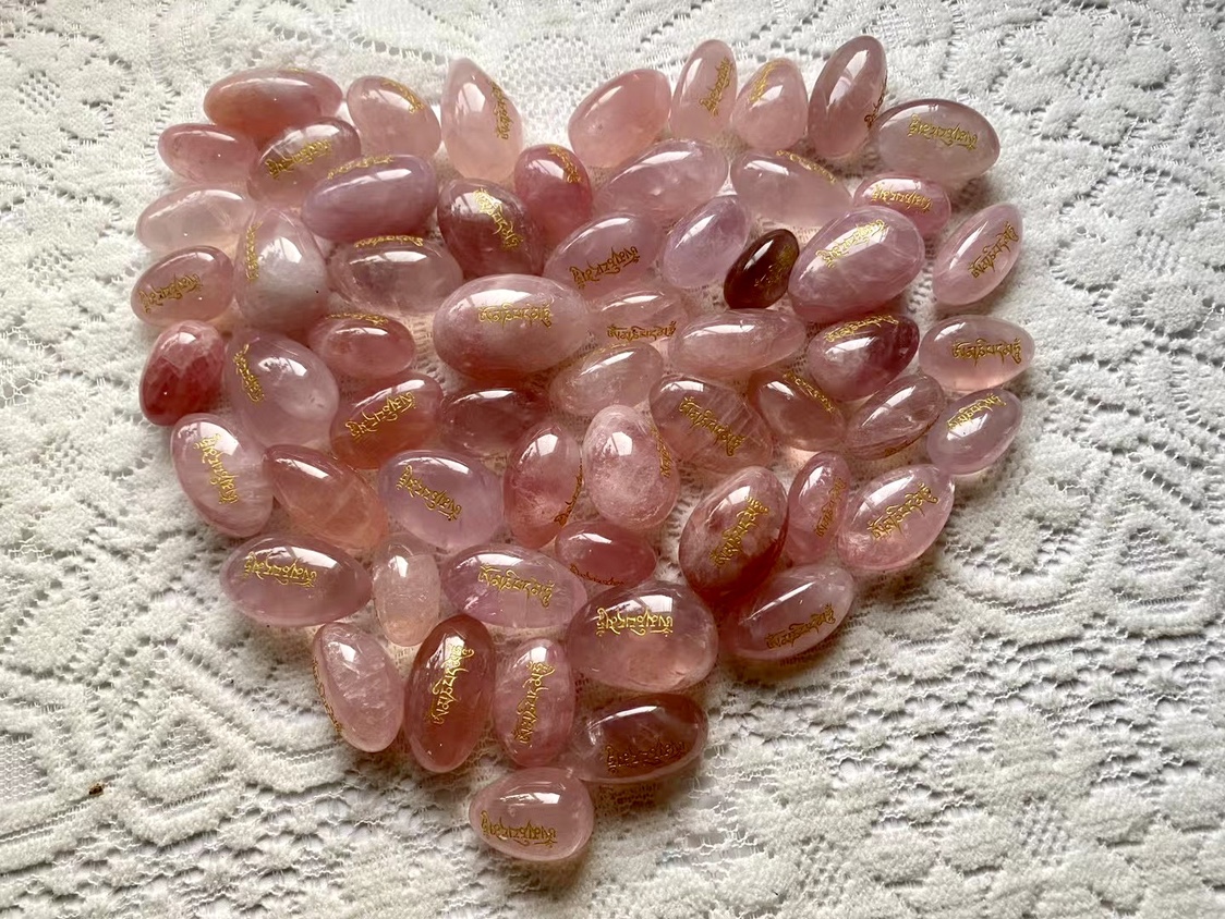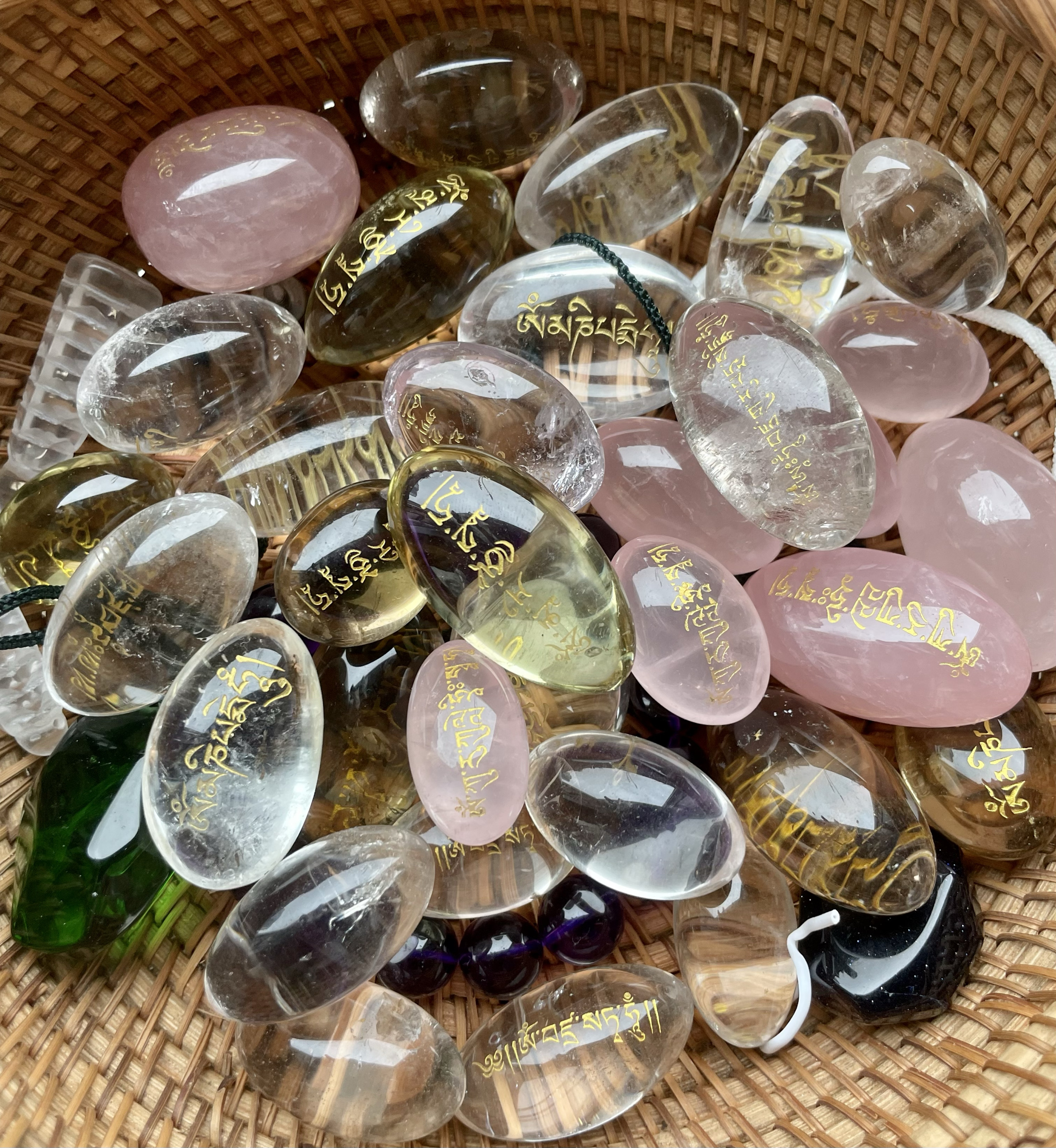 天然粉水晶白水晶玛尼石结缘六字真言大明咒摆件 观音心玛尼石