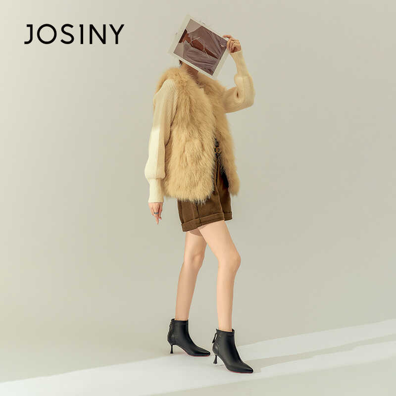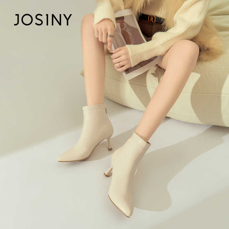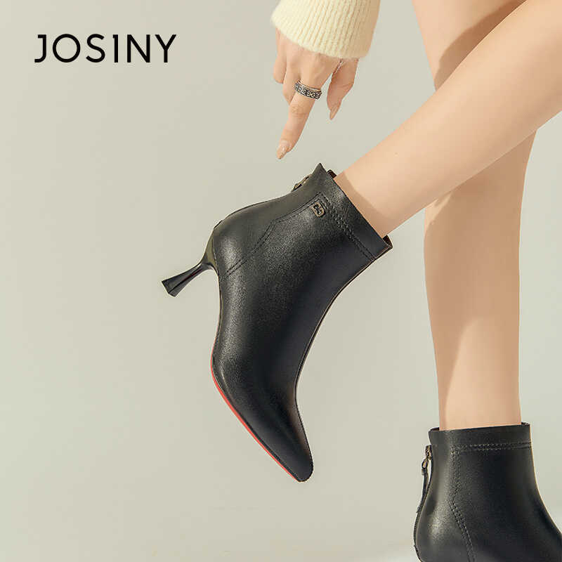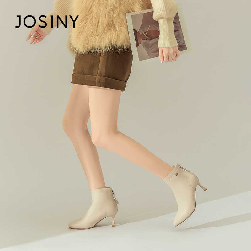 卓诗尼冬季新款女时装靴加绒高跟鞋细跟尖头后拉链舒适韩系高跟鞋