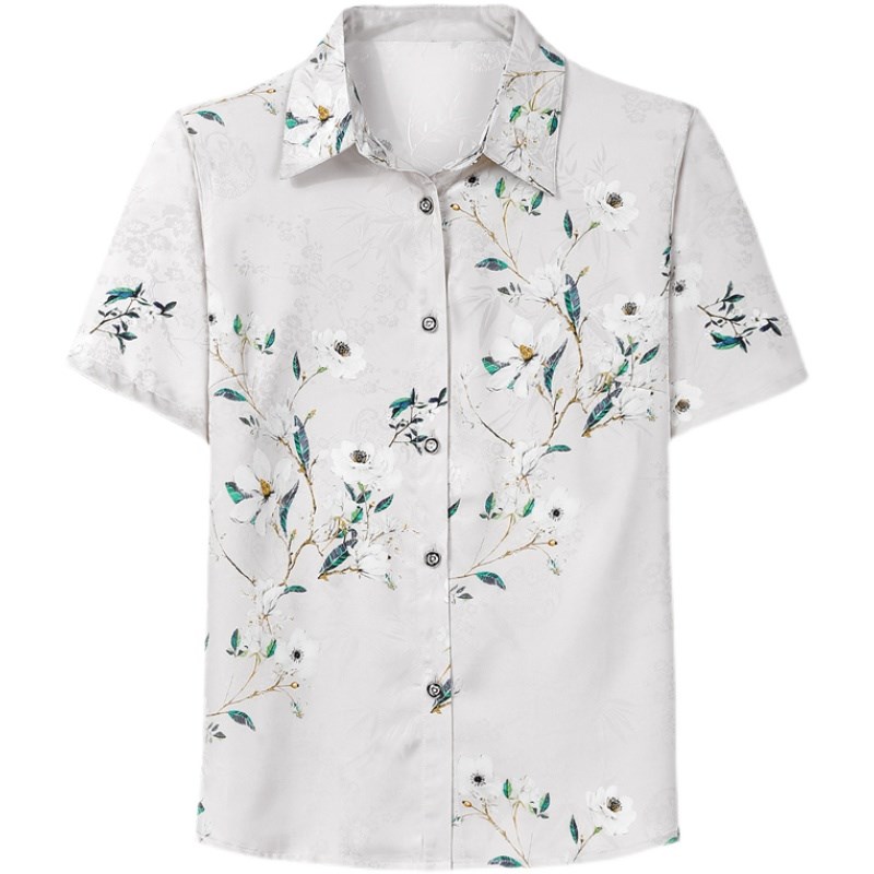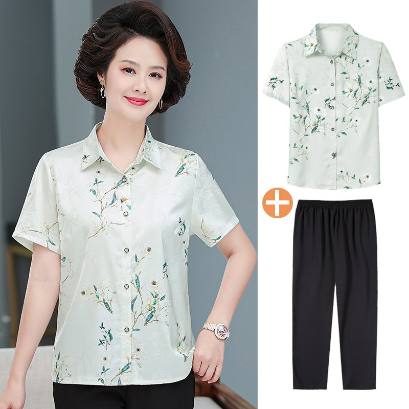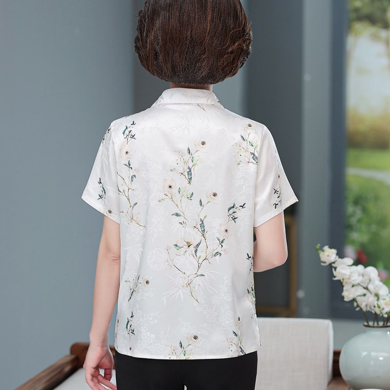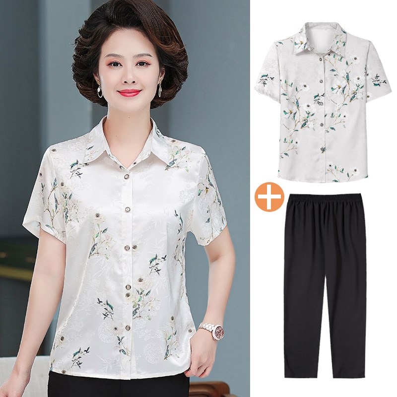 中老年人夏装女免烫真丝衬衫中年妈妈上衣50-60岁奶奶短袖T恤套装