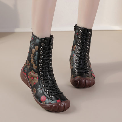 秋冬印花复古民族风女鞋圆头系带平底短靴妈妈鞋真皮软底防滑棉靴
