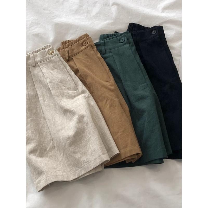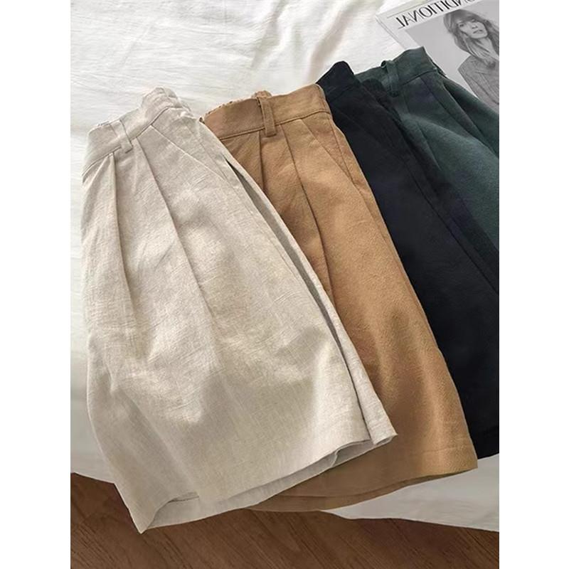 日系复古棉麻短裤女夏季高腰小个子薄款麻料阔腿休闲a字五分裤子