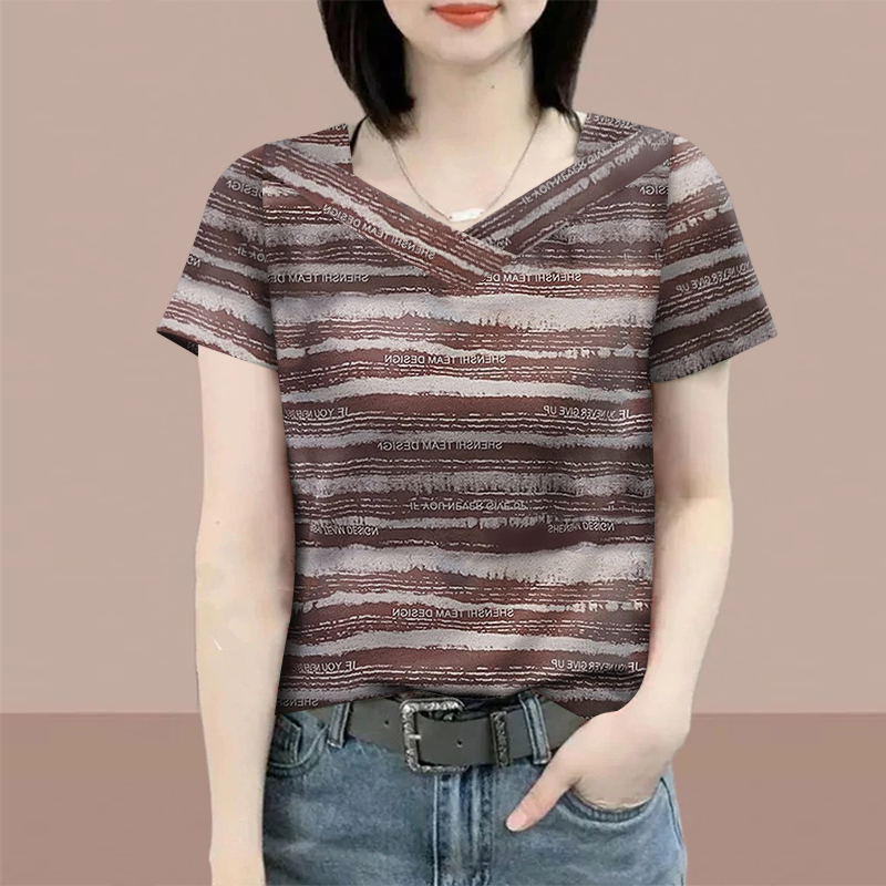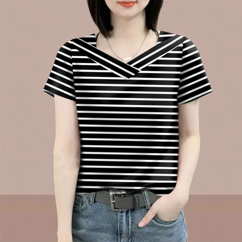 好品捡漏~条纹短袖t恤夏季2025新款宽松体恤休闲正肩v领上衣女