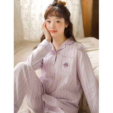 春夏季双层纱纯棉睡衣女孩多巴胺清新可爱刺绣长袖家居服可外穿