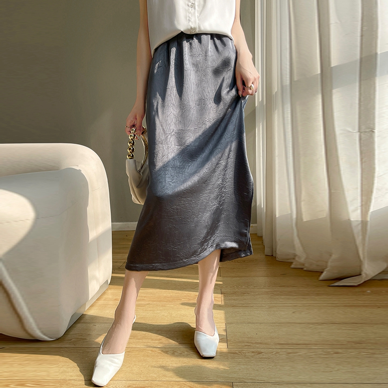 欧货醋酸缎面真丝半身裙春夏显瘦百搭侧开叉打底裙垂感提花黑色裙