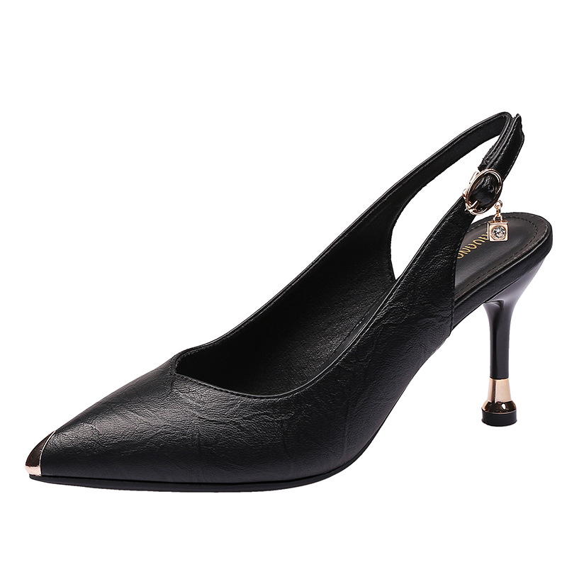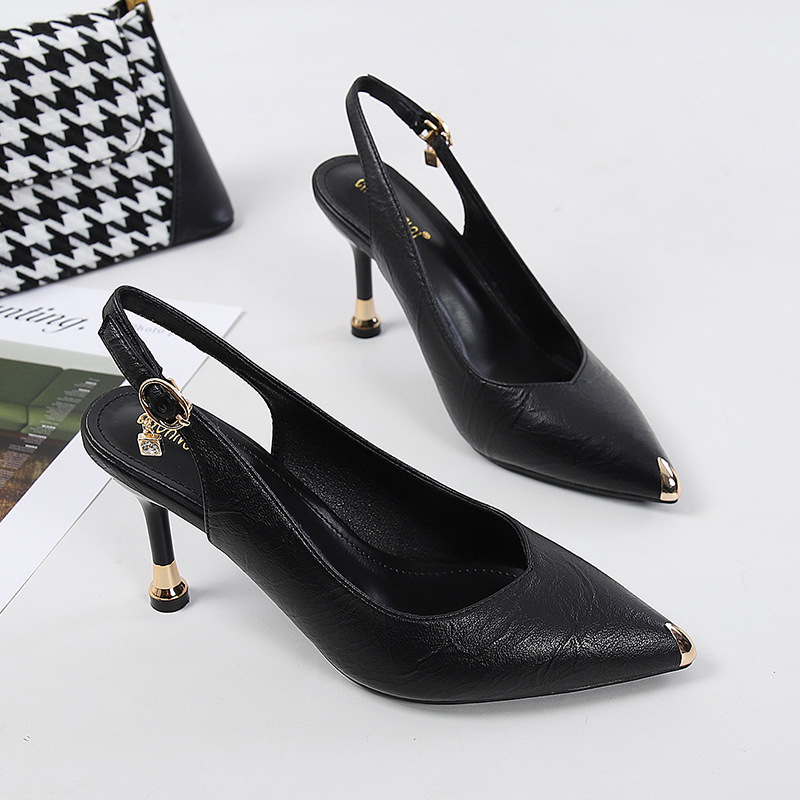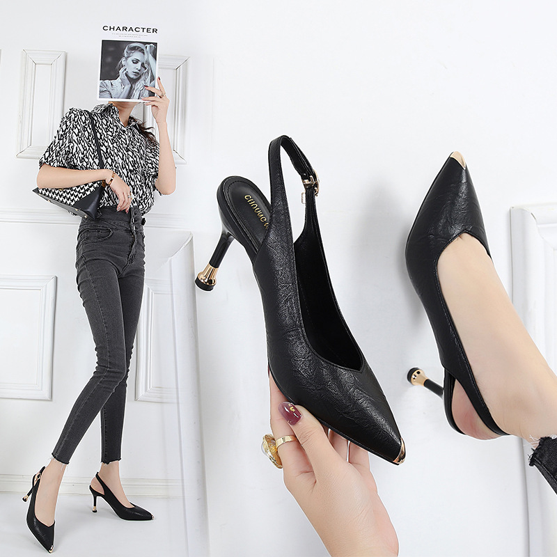 新款春夏软皮尖头包头后空凉鞋细高跟工作职业女凉鞋