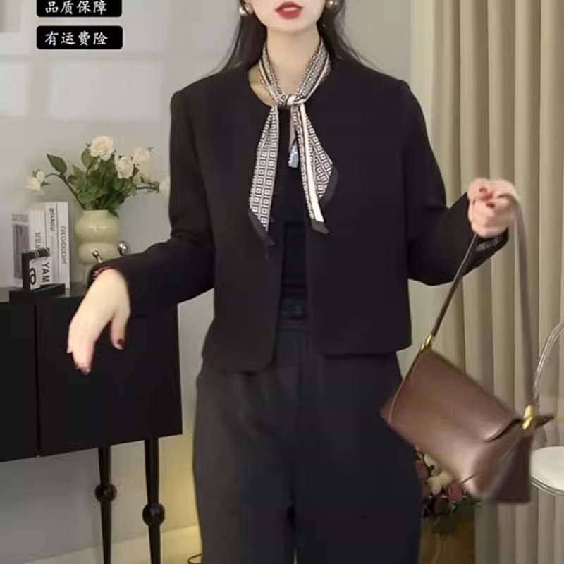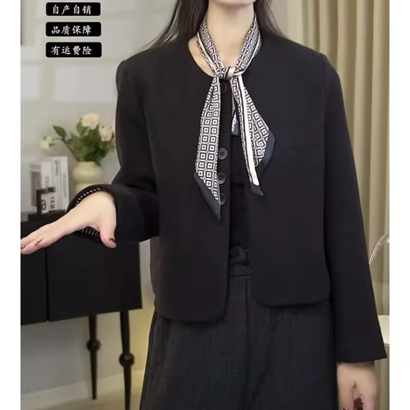 高端小香风时尚圆领加棉毛呢丝巾搭配时尚气质百搭短款外套女显瘦