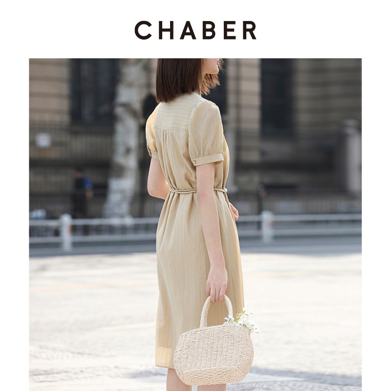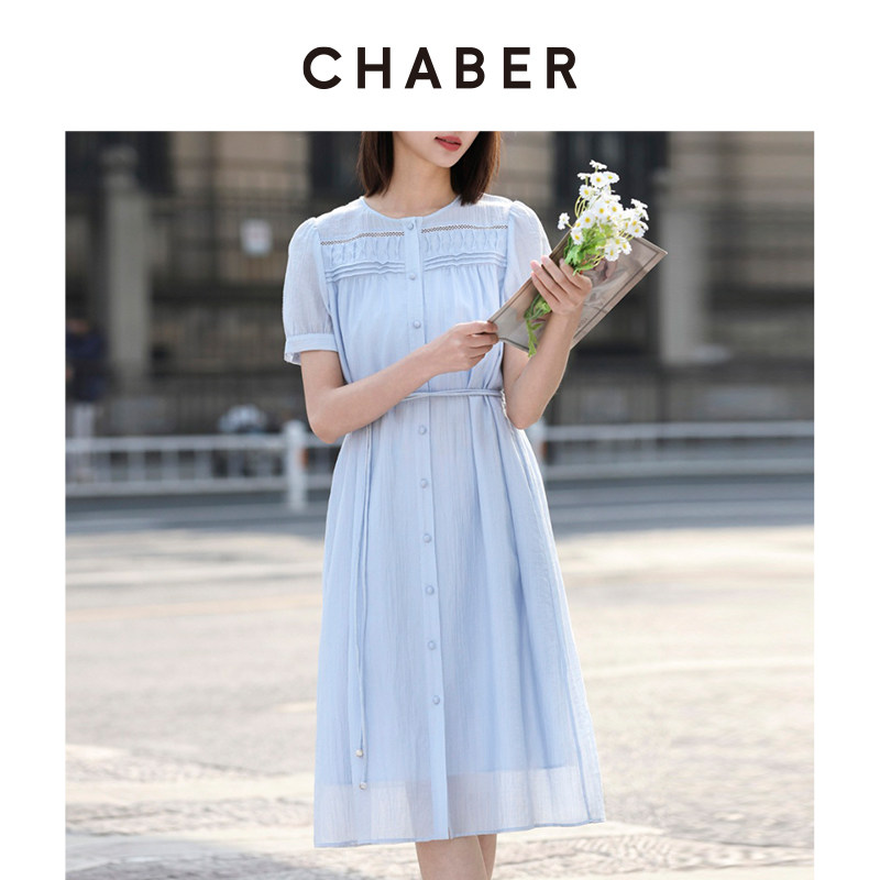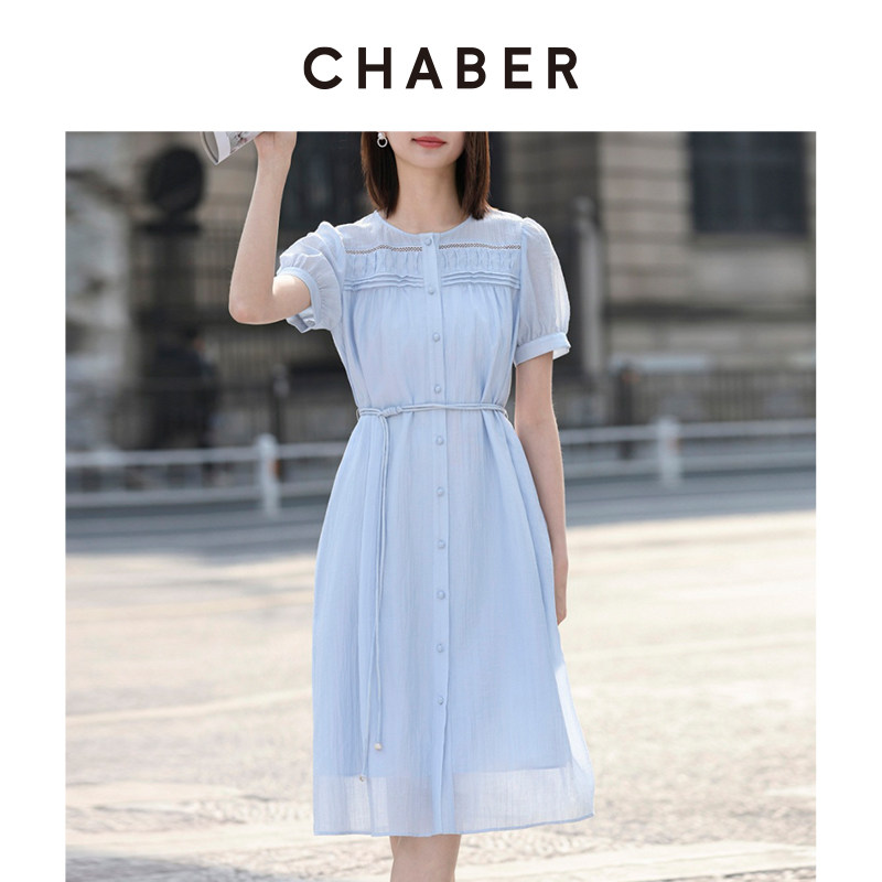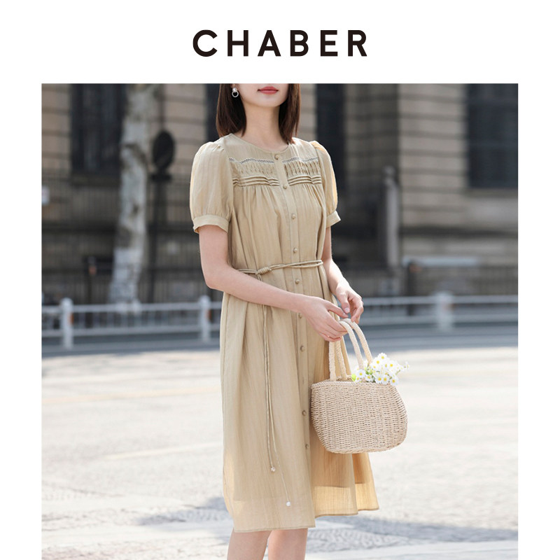chaber巧帛夏季新款圆领短袖A字裙子时尚优雅简约显瘦收腰连衣裙