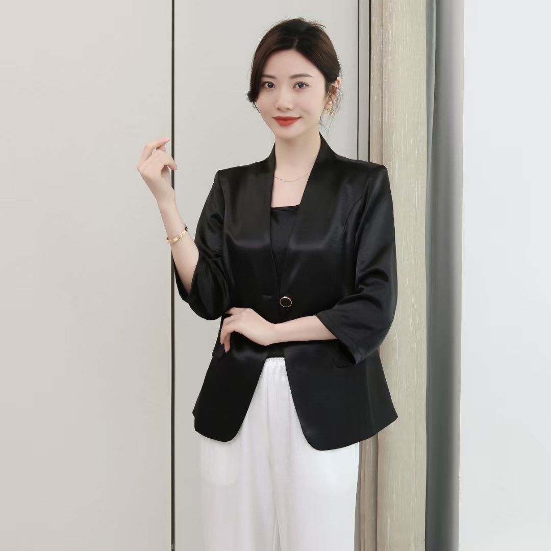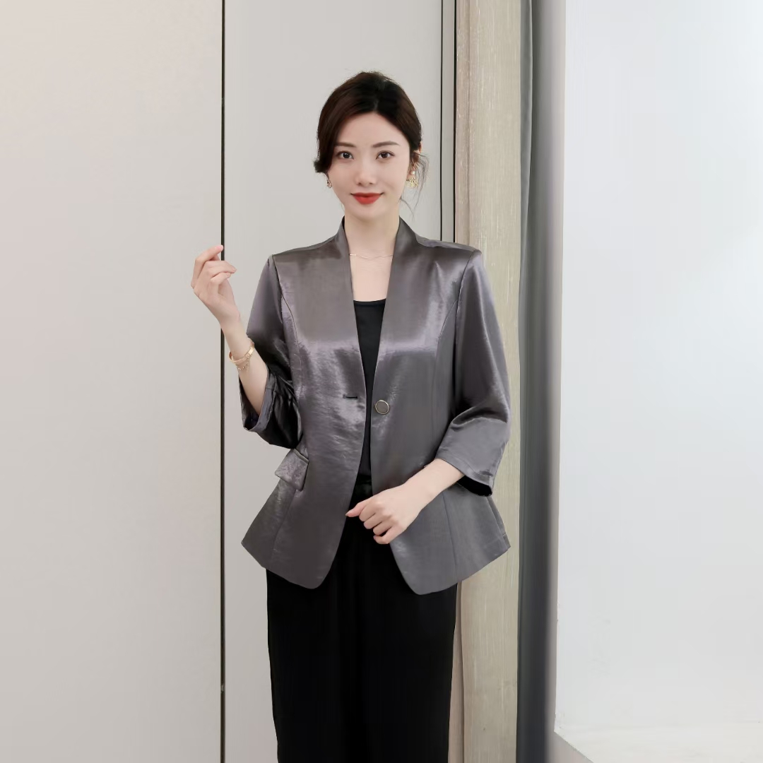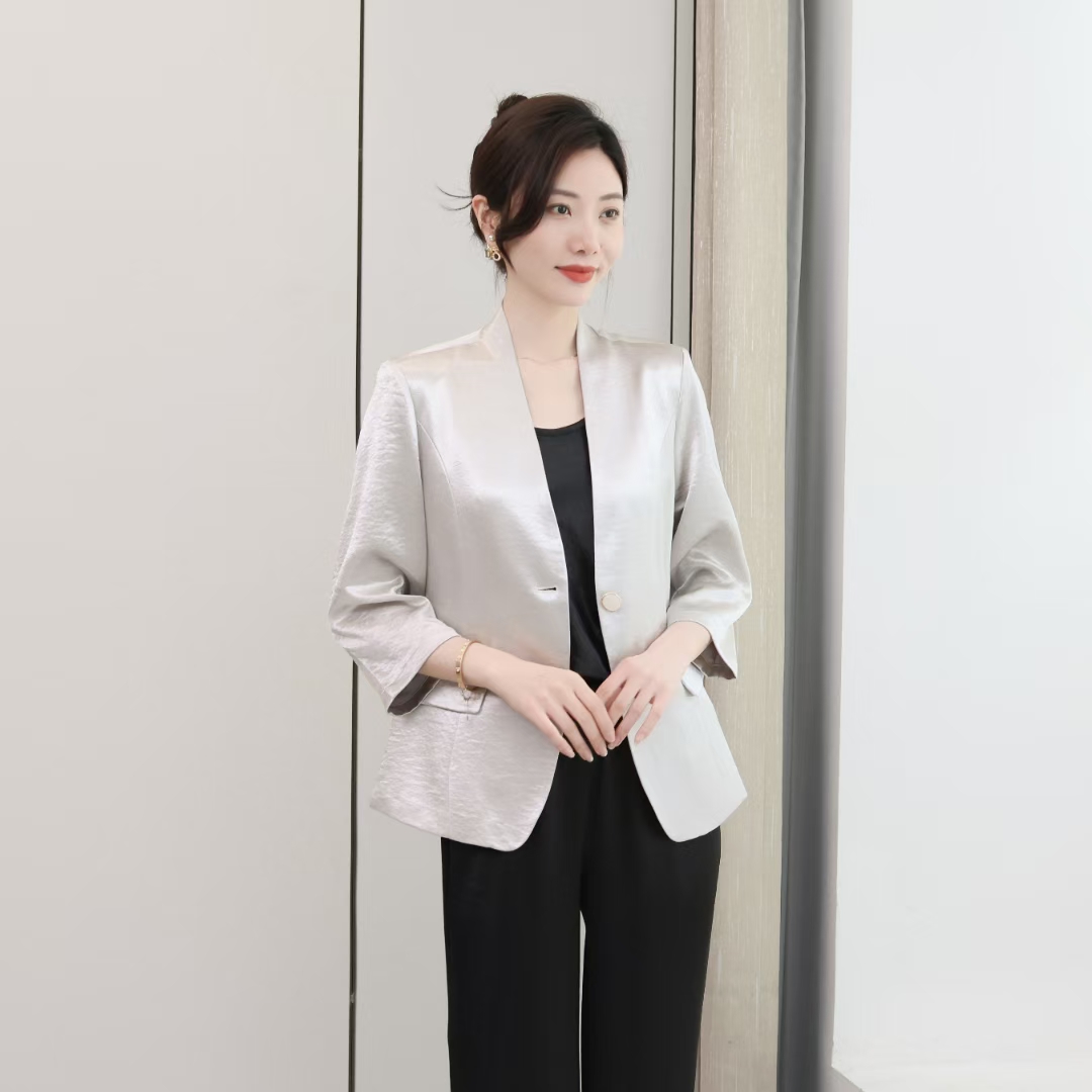 醋酸新款时尚七分袖西装修身外套休闲气质重磅缎面开衫西服上衣女