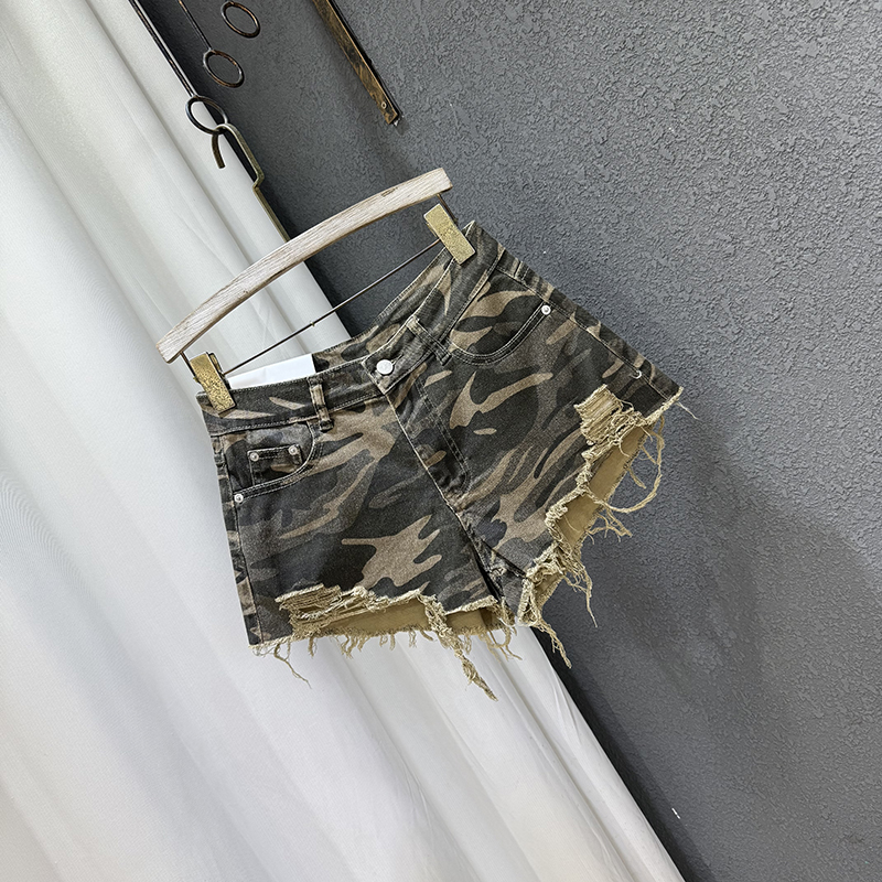 2025夏季新款修身高腰迷彩毛边牛仔短裤女辣妹小个子a字阔腿热裤