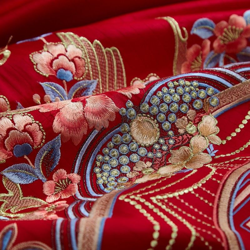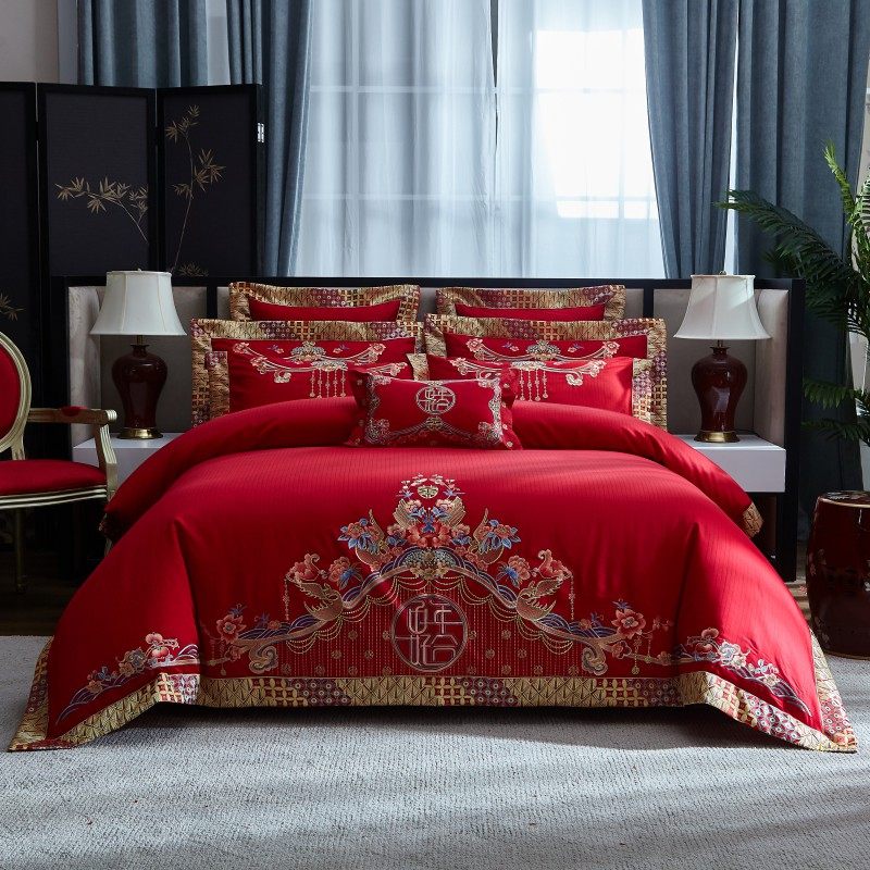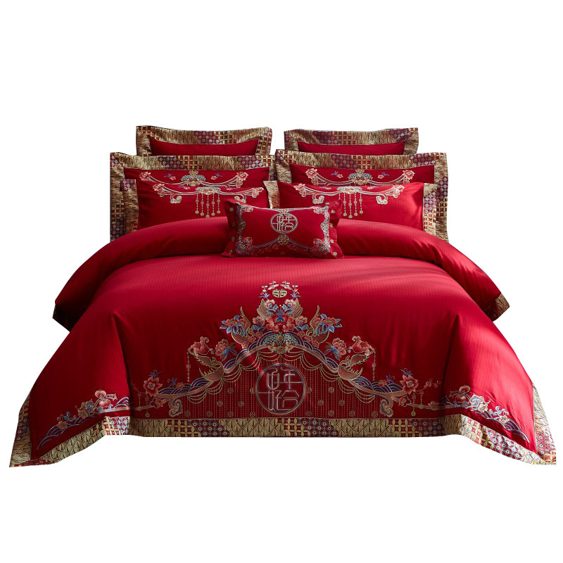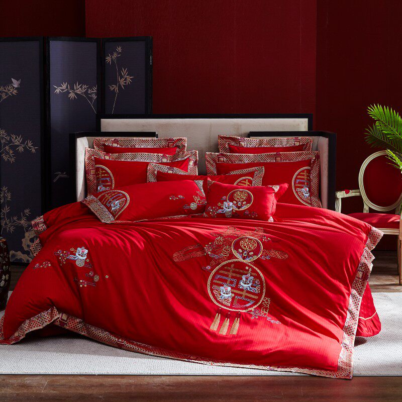 婚庆四件套纯棉婚房大红床单刺绣被套6H0支长绒棉喜庆结婚床上用