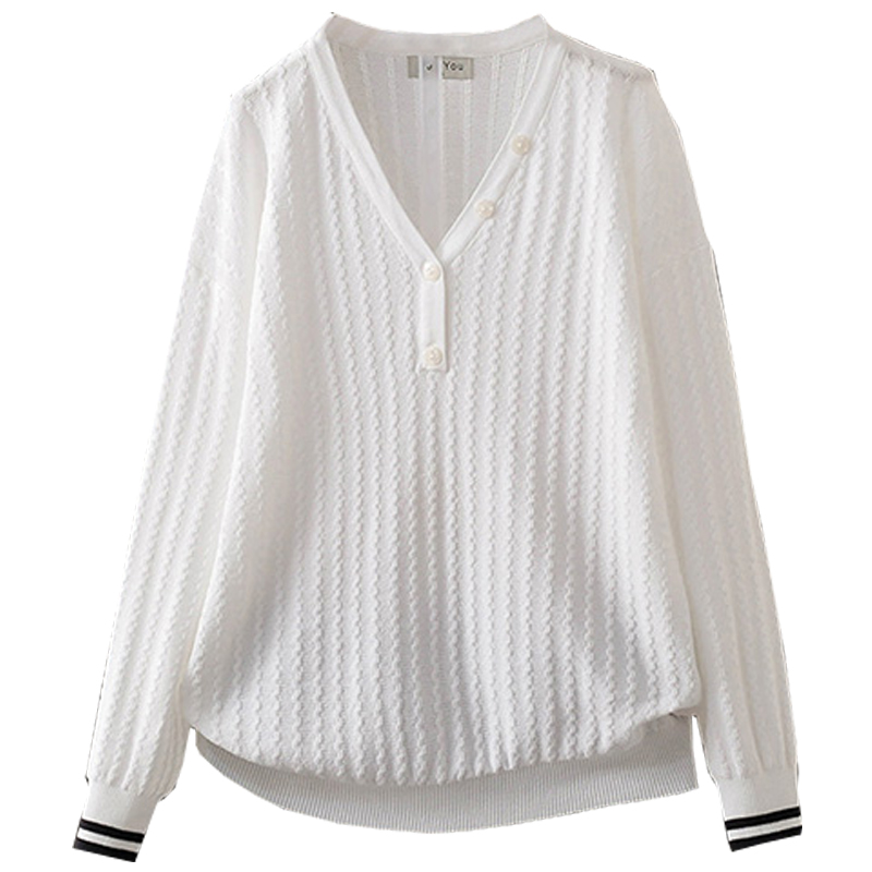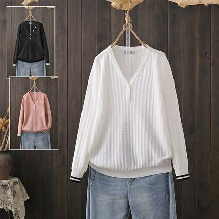 春秋大码200斤V领纽扣针织打底衫女士装时尚长袖洋气小衫毛衣上衣