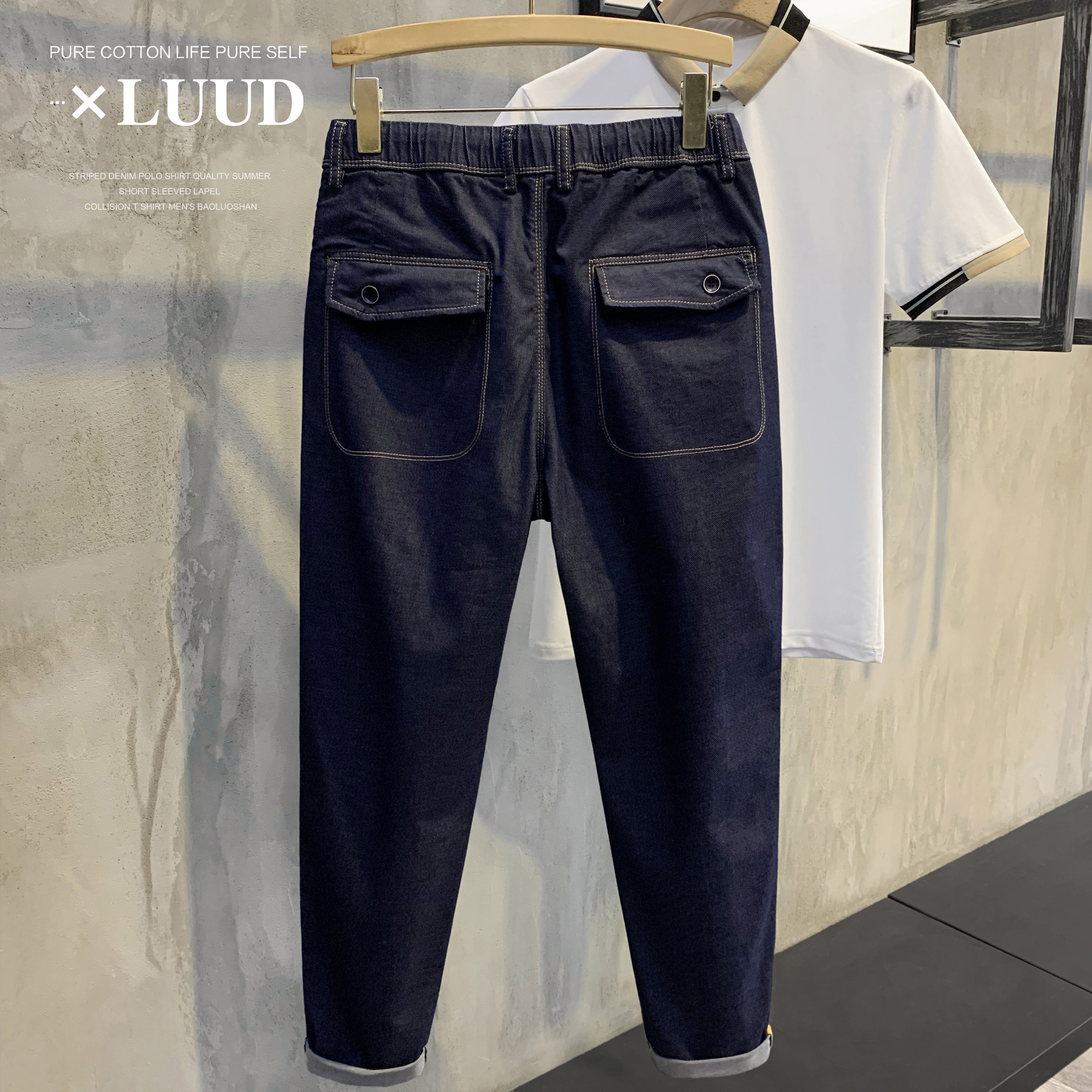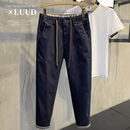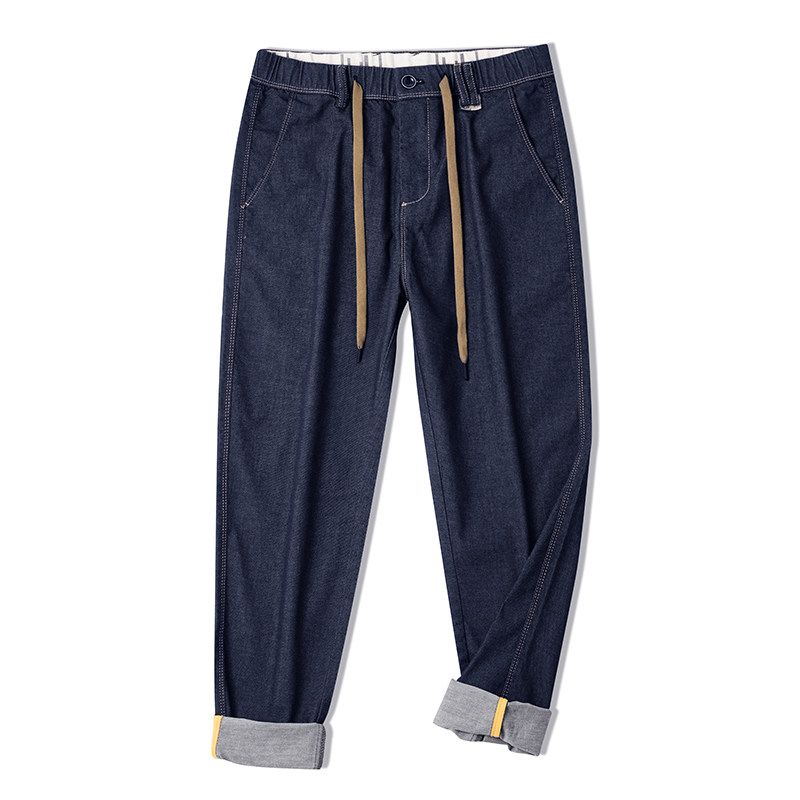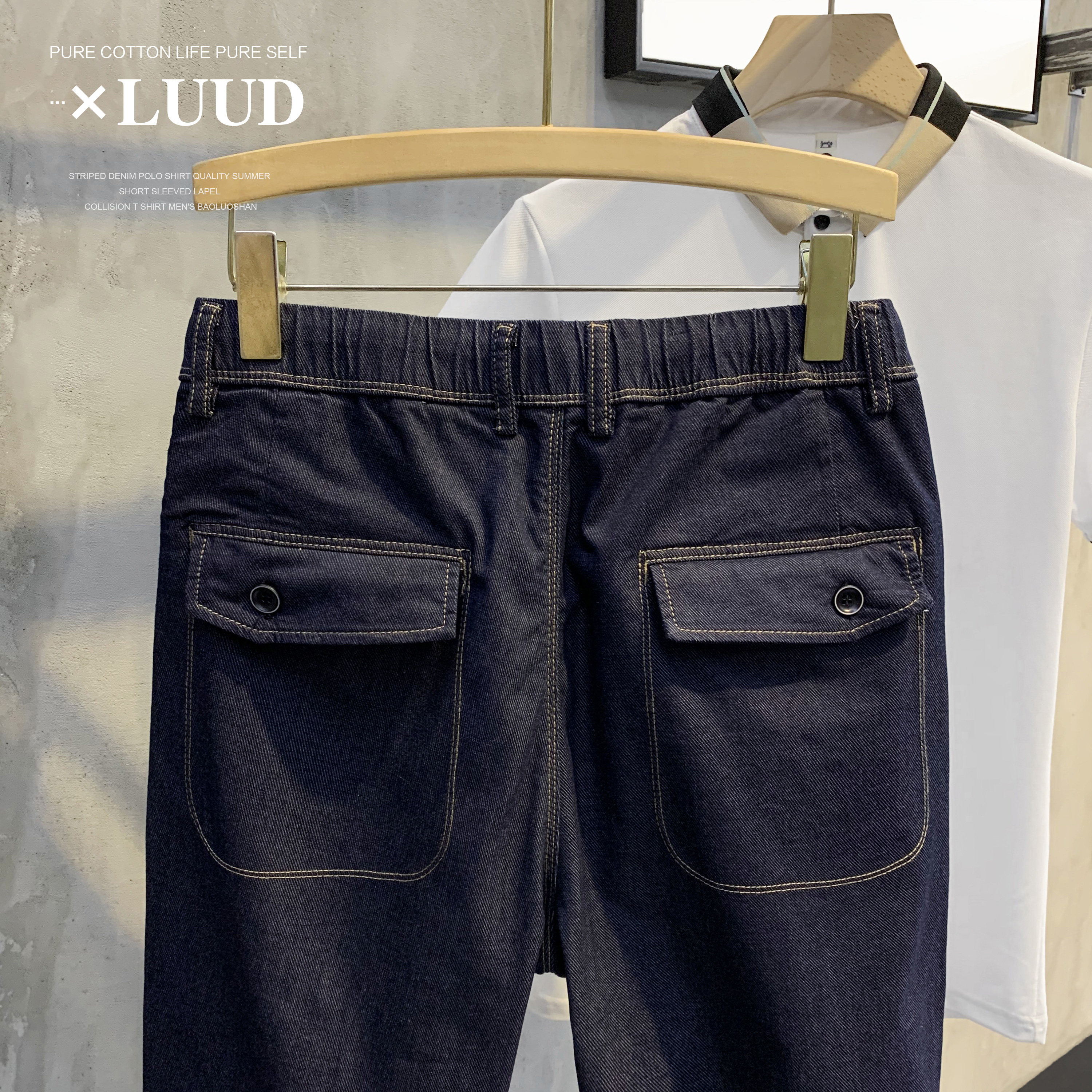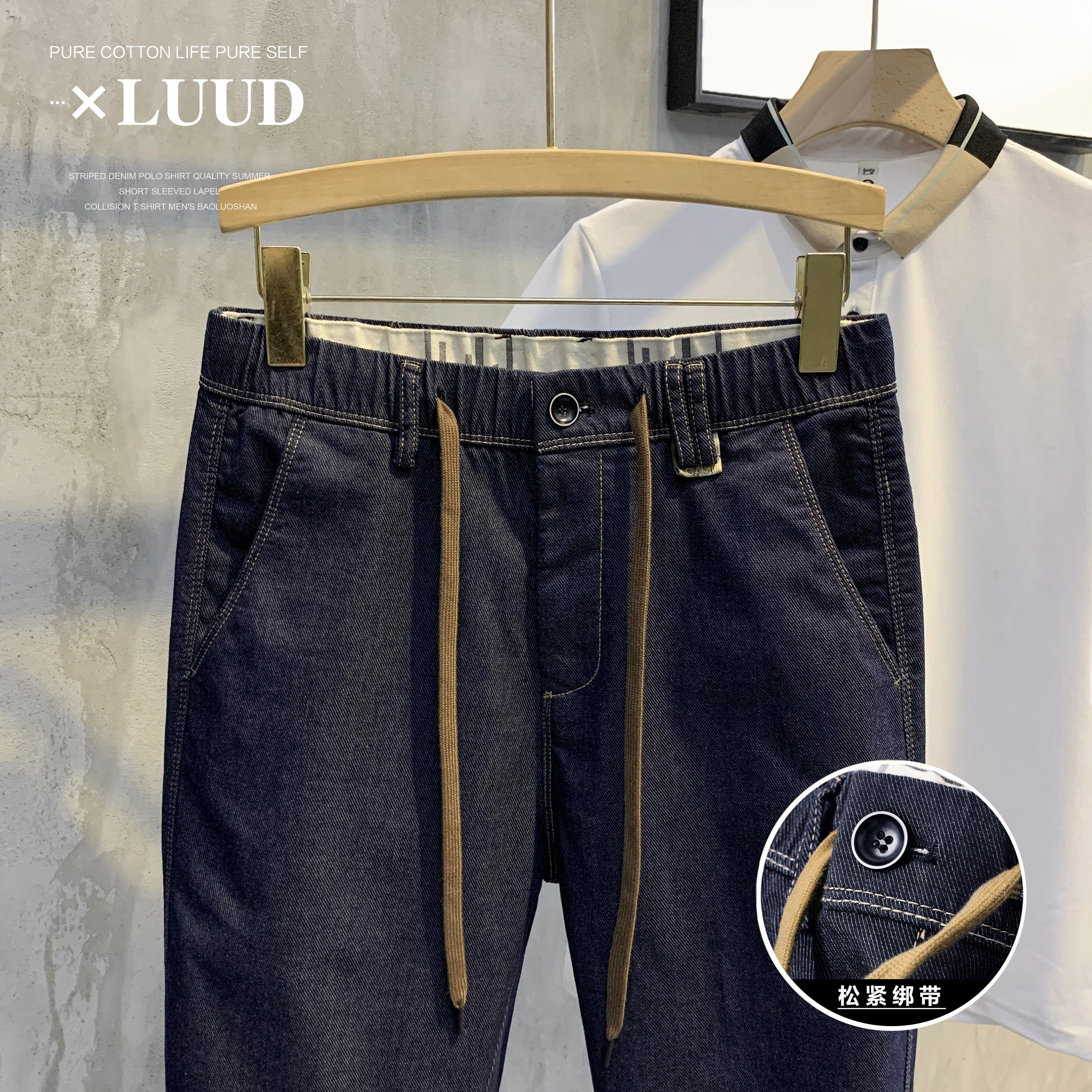 Awesome~夏潮流腰部抽绳工装裤子休闲百搭牛仔裤男士帅气复古长裤