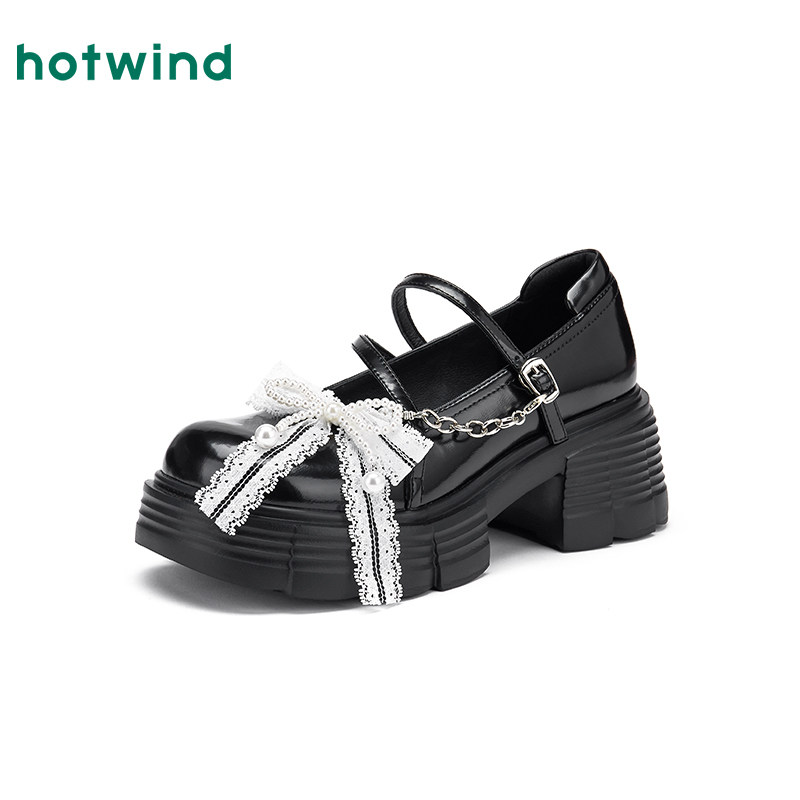 热风粗跟玛丽珍鞋女2025年秋季新款蝴蝶结蕾丝小皮鞋高跟百搭鞋子