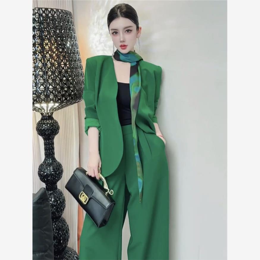 2025春夏网红新款职业西装套装女气质通勤绿色显瘦西服高腰阔腿裤